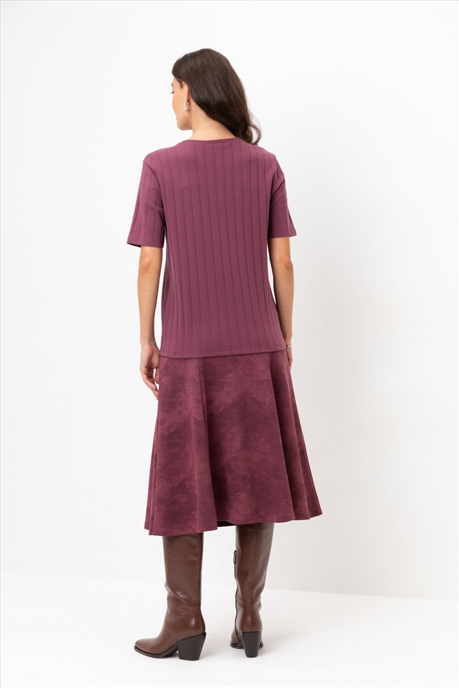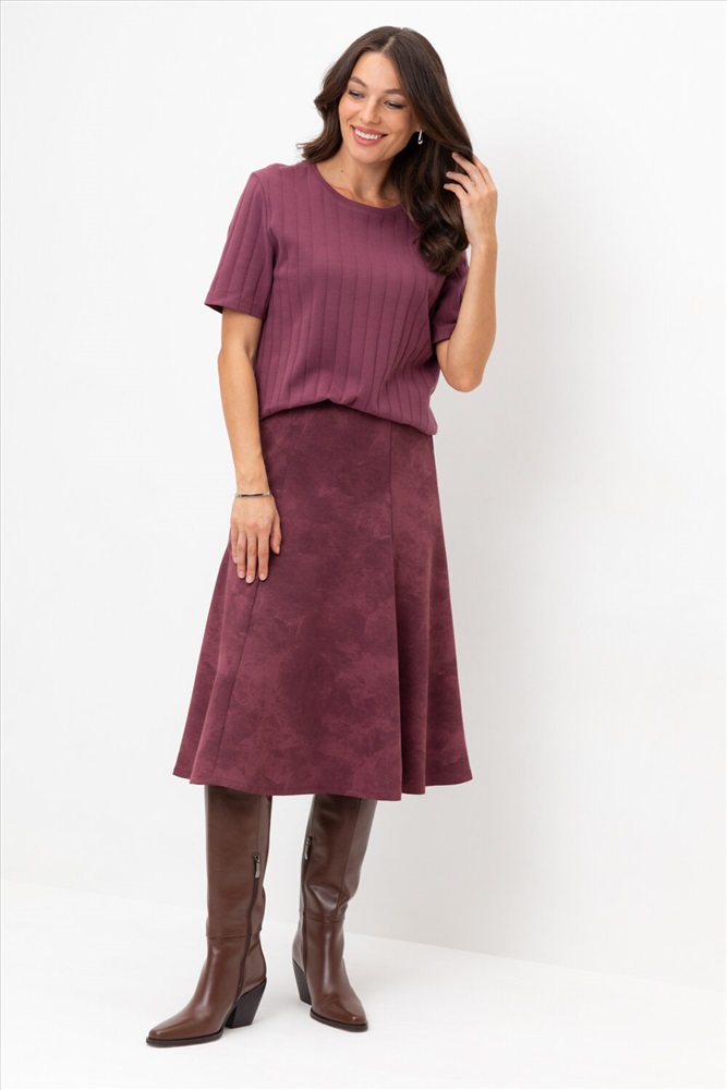 Трикотажная юбка длины миди из плотного гладкого трикотажа интерлок, произведенного из высококачественного гребенного хлопка. В составе 80% натурального хлопка и 20% полиэстера, при этом полиэстер ввязан внутрь по особой технологии и не соприкасается с кожей. Застегивается на потайную молнию. Изделие сохраняет цвет и форму после многократных стирок.