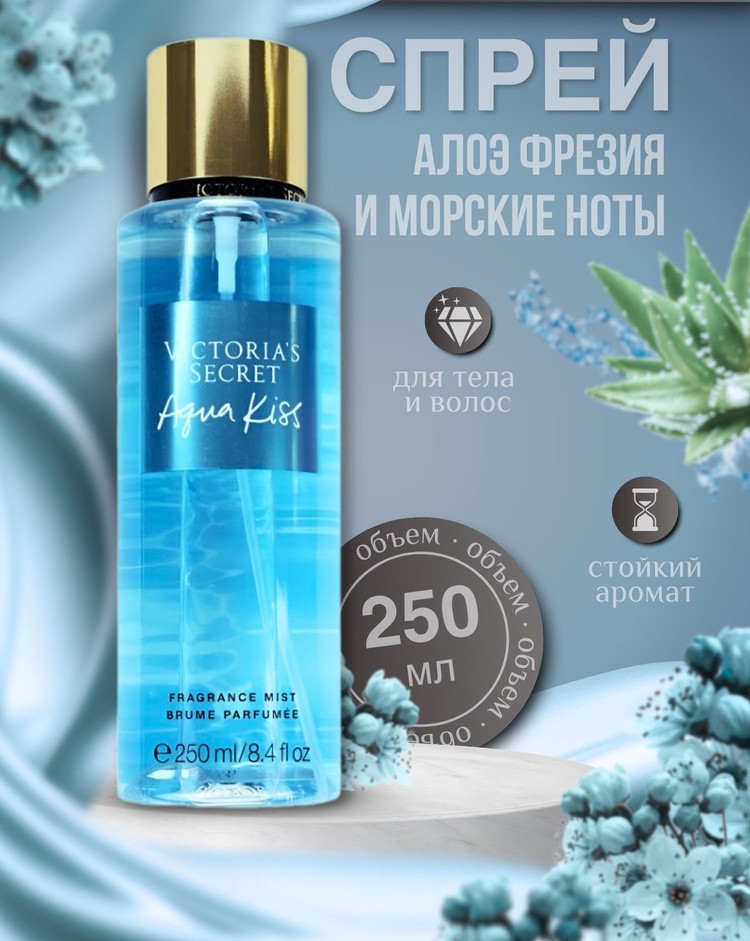 Victoria's Secret Aqua Kiss — парфюмированный спрей для тела, воплощающий лёгкость морского бриза и свежесть цветочного сада, окутанного нежной сладостью.