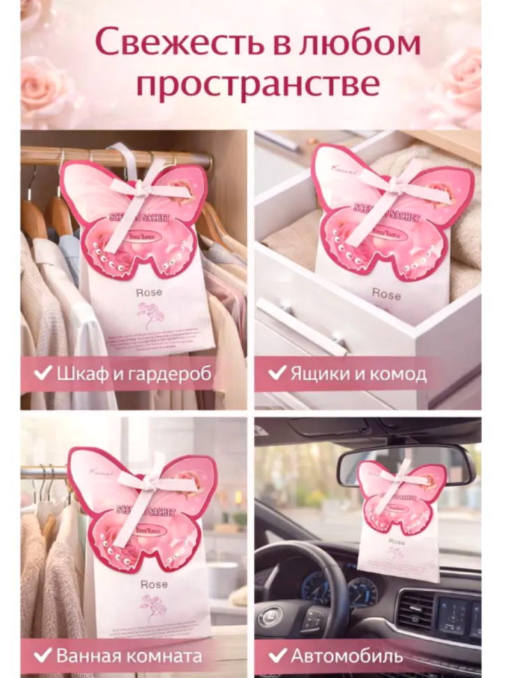 Подарите своему дому и гардеробу неповторимую свежесть с набором из двух аромасаше с нежным запахом роз. Эти небольшие, но очень эффективные ароматизаторы станут отличным решением для тех, кто ценит уют и свежесть в каждом уголке своей жизни. Поместите их в шкаф с бельём, гардеробную или рядом с одеждой — и ваши вещи всегда будут наполняться приятным ароматом, который напоминает о цветущем саде и теплых весенних днях. Наши ароматизированные саше идеально впишутся не только в домашний интерьер, но и станут отличным освежителем для автомобиля и машины. Компактный комплект из двух штук позволяет использовать их одновременно или по отдельности, подстраиваясь под любые ваши нужды. Такие ароматические помощники подчеркнут стиль вашего пространства, создавая гармоничную атмосферу, полную свежести и легкости. Вы можете смело использовать наши аромасаше в туалете, ванной, возле кровати или в комоде. Благодаря приятной отдушке они легко убирают нежелательные запахи и наполняют воздух тонкими цветовыми нотами.