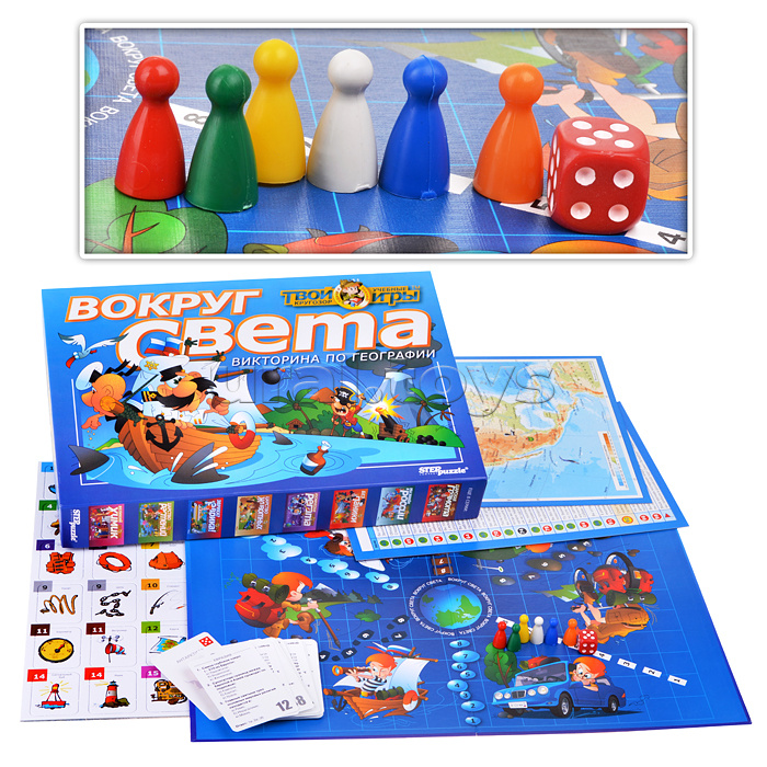 Код: 153784 Страна производитель: Россия Размеры упаковки: 41 x 27 x 6 см Количество в коробке: 9 Вокруг света: • В наборе: • игровое поле. • карточки с вопросами (105 шт). • карточки с рисунками (30 шт). • жетоны (74 шт). • двухсторонние географические карты (3 шт). • кубик. • 6 фишек. • правила игры. • Материал: пластик, картон. • Соответствует требованиям безопасности продукции. • Для детей от 5 лет. Комментарии к товару