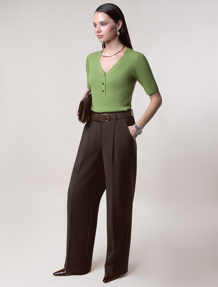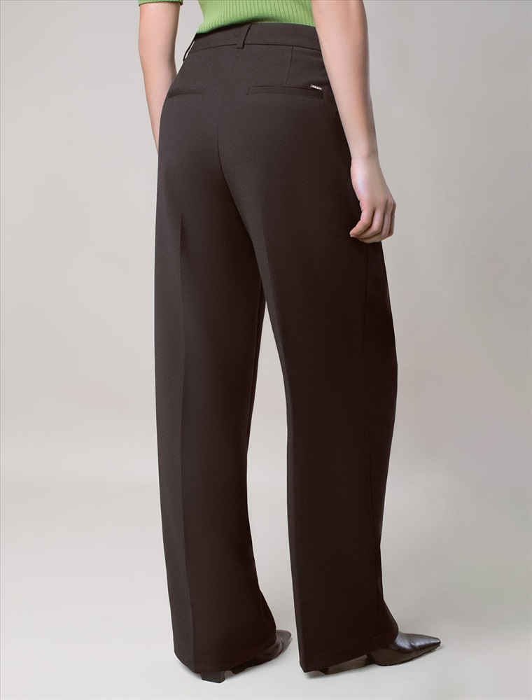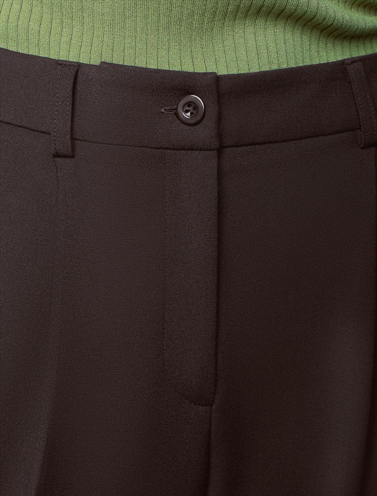 Брюки-палаццо выполнены из эластичной поливискозы. Легкая и струящаяся ткань идеально подойдет для повседневных образов. Модель с высокой посадкой визуально стройнит и вытягивает силуэт, удлиняет ноги. По верхнему краю спереди классически заложены складки, что придает свободы и простора в районе бедер. Свободный силуэт подходит для любой фигуры.
