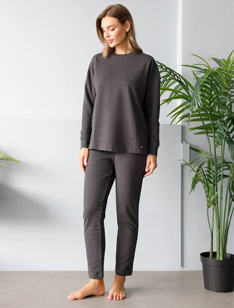 Брюки выполнены из тонкого хлопкового футера. Эластичный материал хорошо пропускает воздух, позволяя телу дышать, и легко тянется, не ограничивая движения. Пояс на резинке дополнен внутренним шнуром, для комфортной регулировки изделия. Брюки сочетаются в костюме с джемпером D49.054 и D49.055