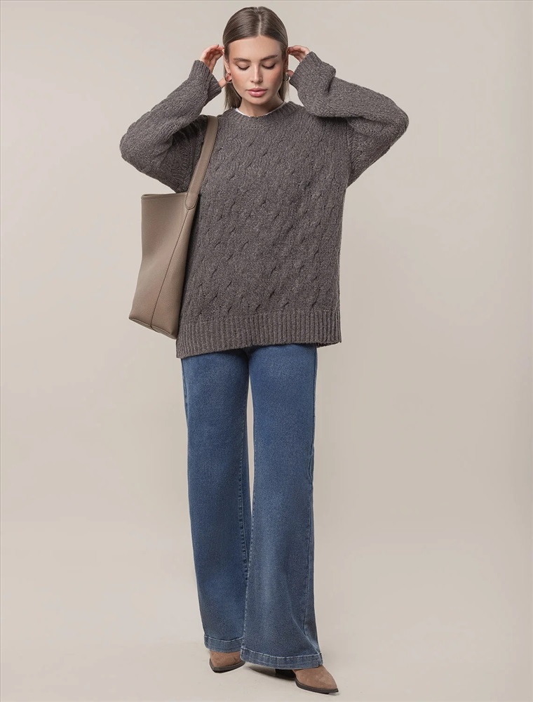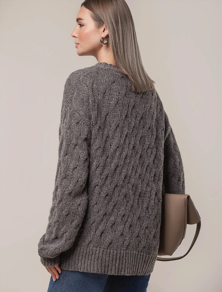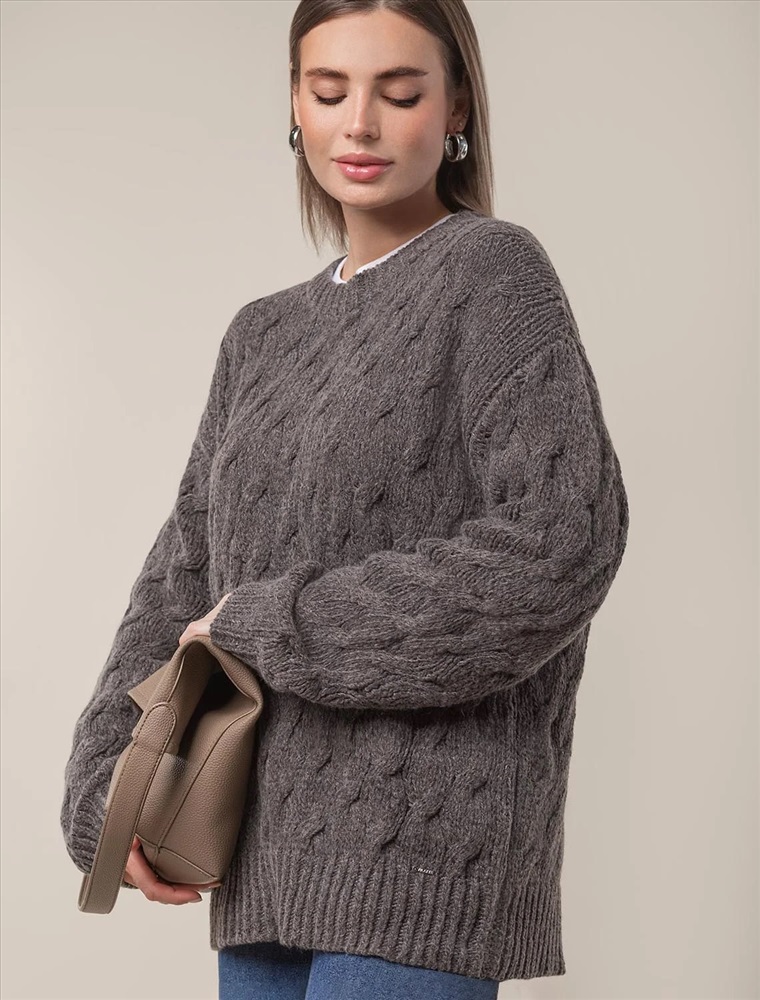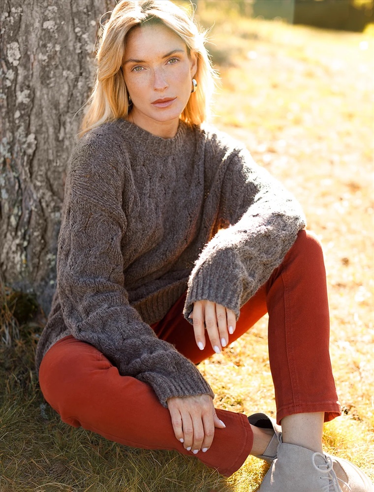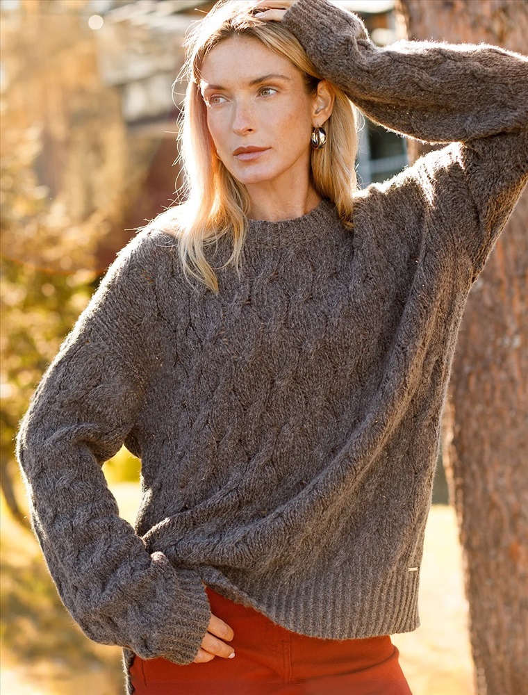 Джемпер в кофейном оттенке выполнен из уютной меланжевой пряжи крупной вязки с ангорой и легким пушистым мохером. Модель с фактурным узором косы очень приятная на ощупь, в которую хочется укутаться. Отлично согревает, а свободный силуэт позволяет носить изделие на футболку или рубашку. Из украшений металлический логотип бренда.