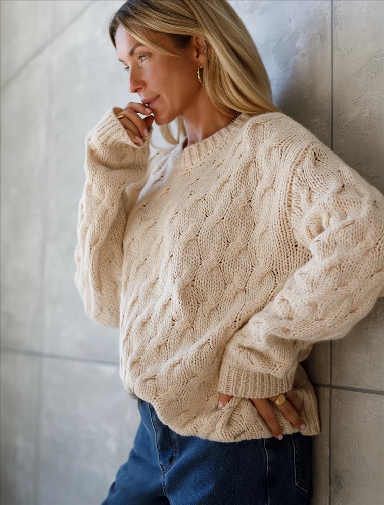Джемпер в овсяном оттенке выполнен из уютной пряжи крупной вязки с ангорой и легким пушистым мохером. Модель с фактурным узором косы очень приятная на ощупь, в которую хочется укутаться. Отлично согревает, а свободный силуэт позволяет носить изделие на футболку или рубашку. Из украшений металлический логотип бренда.