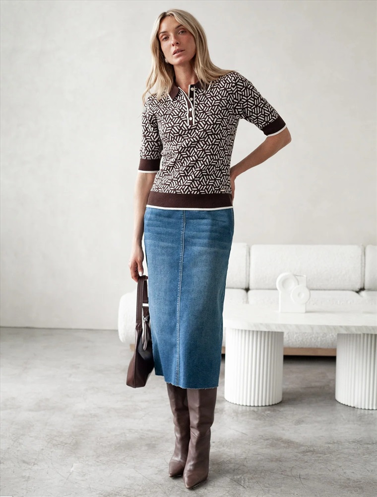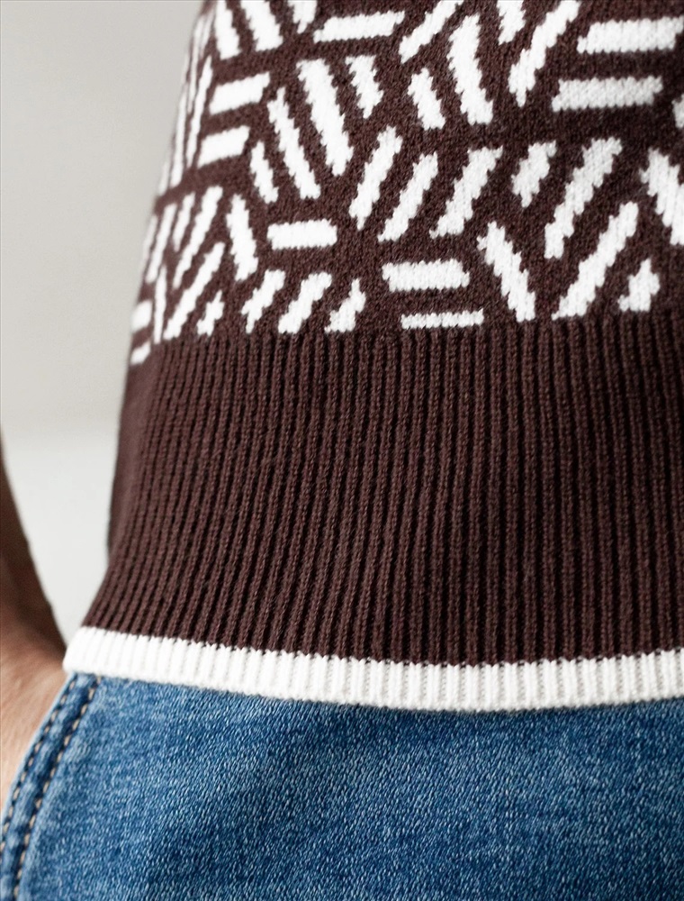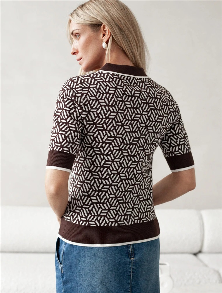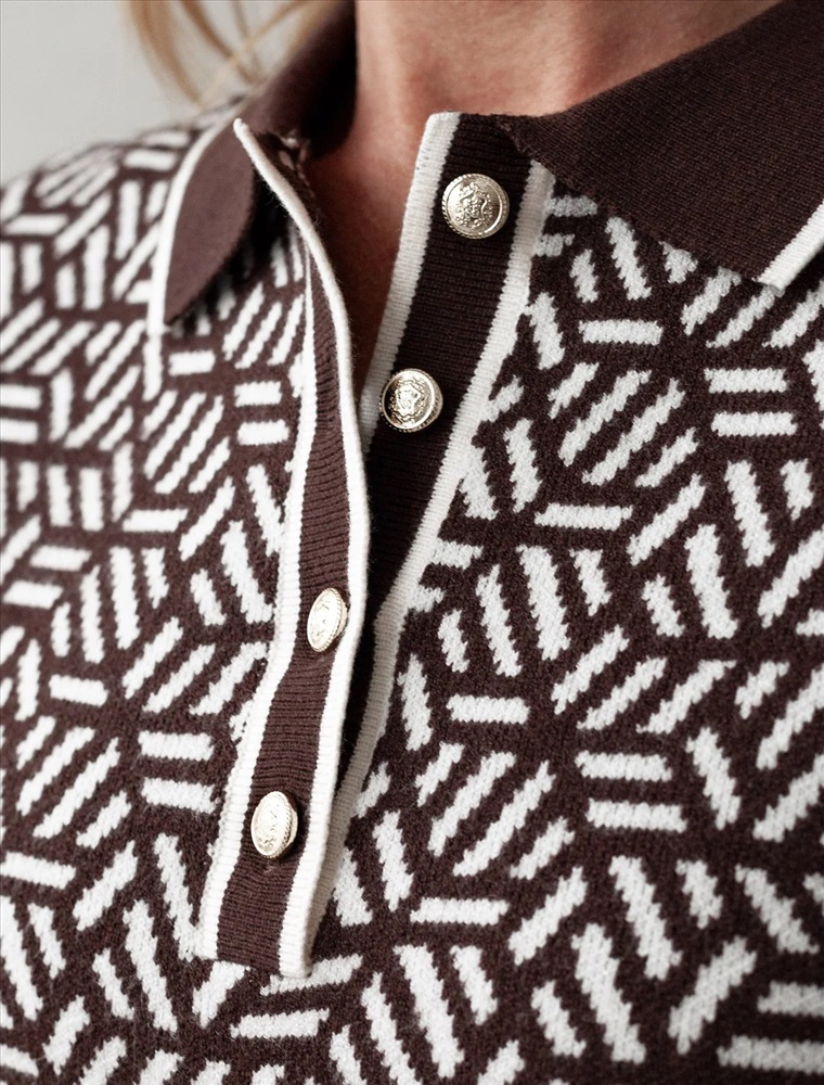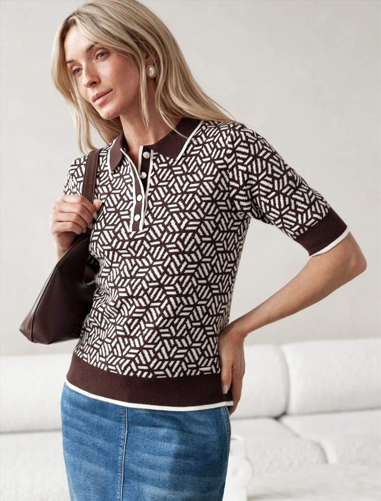 Джемпер жаккардовой вязки выполнено из нежной пряжи на основе вискозы с добавлением кашемира. Модель прямого силуэта с застежкой планкой как у поло. Фигурные золотистые пуговицы вносят изысканности и роскоши. Изделие приятно ощущается на теле и поддерживает комфортный микроклимат. Сочетается в комплекте total-look с жакетом D31.150