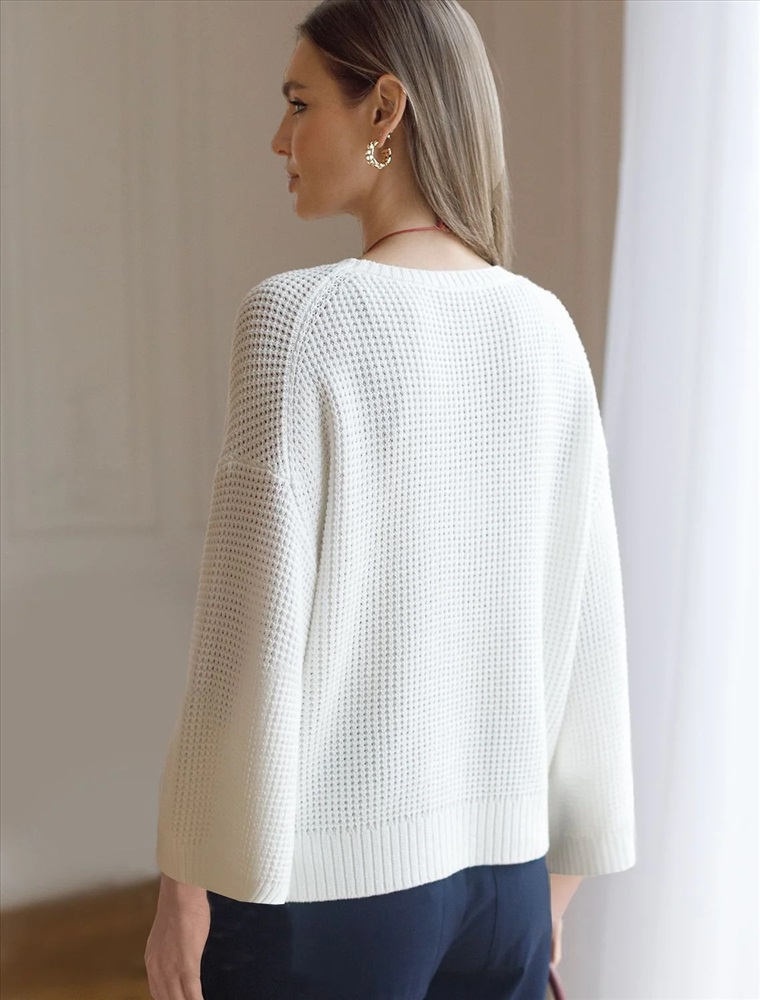 Стильный укороченный джемпер белого цвета создан для тех, кто ценит современный образ и комфорт. Свободный крой подчеркивает легкость и позволяет чувствовать себя уютно в любой ситуации. Рельефная вязка в виде оригинального узора "шашечки" добавляет джемперу выразительности. Благодаря натуральному хлопку повседневный джемпер обеспечивает комфорт даже в жаркие дни: хлопок позволяет коже дышать и поддерживает оптимальный микроклимат. А акрил в составе придает мягкость, отличную цветостойкость, а также гипоаллергенность и устойчивость к деформации, что делает джемпер легким в уходе. Круглый ворот и спущенная линия плеча добавляют образу аккуратности и расслабленности. Широкие рукава создают воздушность и делают силуэт особенно женственным. Такой джемпер легко сочетать с широкими и узкими низами для создания повседневного или более нарядного ансамбля. Джемпер отлично подойдет для прохладных весенних и летних дней благодаря плотности материала, а также станет удачным решением для многослойных луков. Вязка подчеркивает индивидуальность вещи и привлекает внимание к деталям вашего стиля.