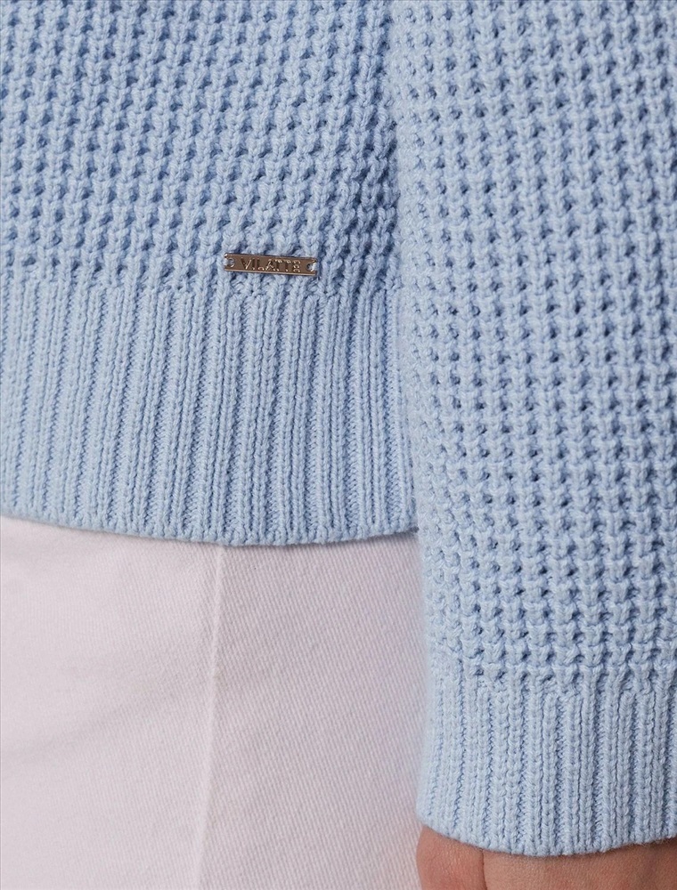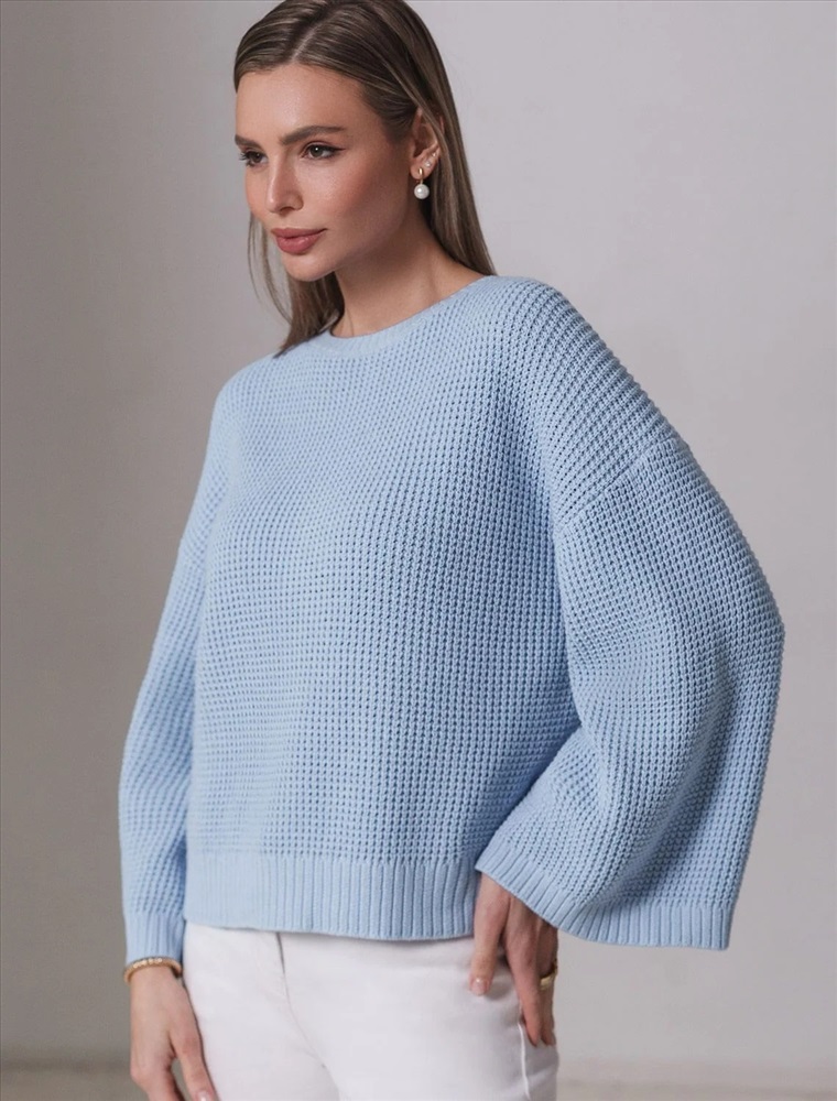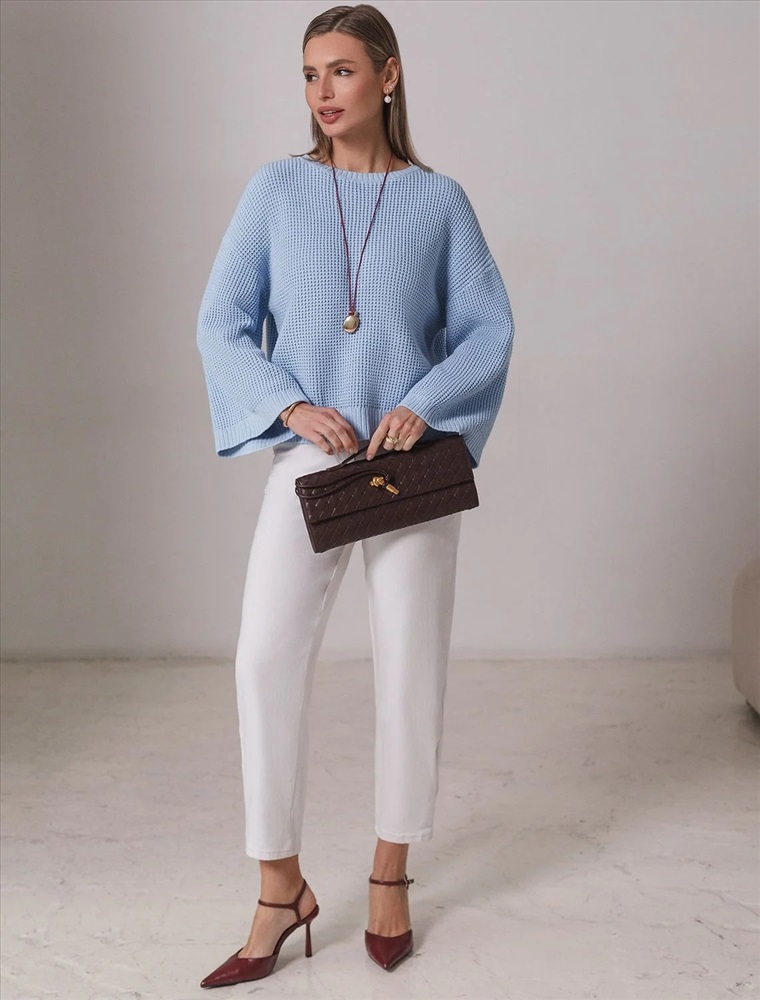 Стильный укороченный джемпер светло-голубого цвета создан для тех, кто ценит современный образ и комфорт. Свободный крой подчеркивает легкость и позволяет чувствовать себя уютно в любой ситуации. Рельефная вязка в виде оригинального узора "шашечки" добавляет джемперу выразительности. Благодаря натуральному хлопку повседневный джемпер обеспечивает комфорт даже в жаркие дни: хлопок позволяет коже дышать и поддерживает оптимальный микроклимат. А акрил в составе придает мягкость, отличную цветостойкость, а также гипоаллергенность и устойчивость к деформации, что делает джемпер легким в уходе. Круглый ворот и спущенная линия плеча добавляют образу аккуратности и расслабленности. Широкие рукава создают воздушность и делают силуэт особенно женственным. Такой джемпер легко сочетать с широкими и узкими низами для создания повседневного или более нарядного ансамбля. Джемпер отлично подойдет для прохладных весенних и летних дней благодаря плотности материала, а также станет удачным решением для многослойных луков. Вязка подчеркивает индивидуальность вещи и привлекает внимание к деталям вашего стиля.