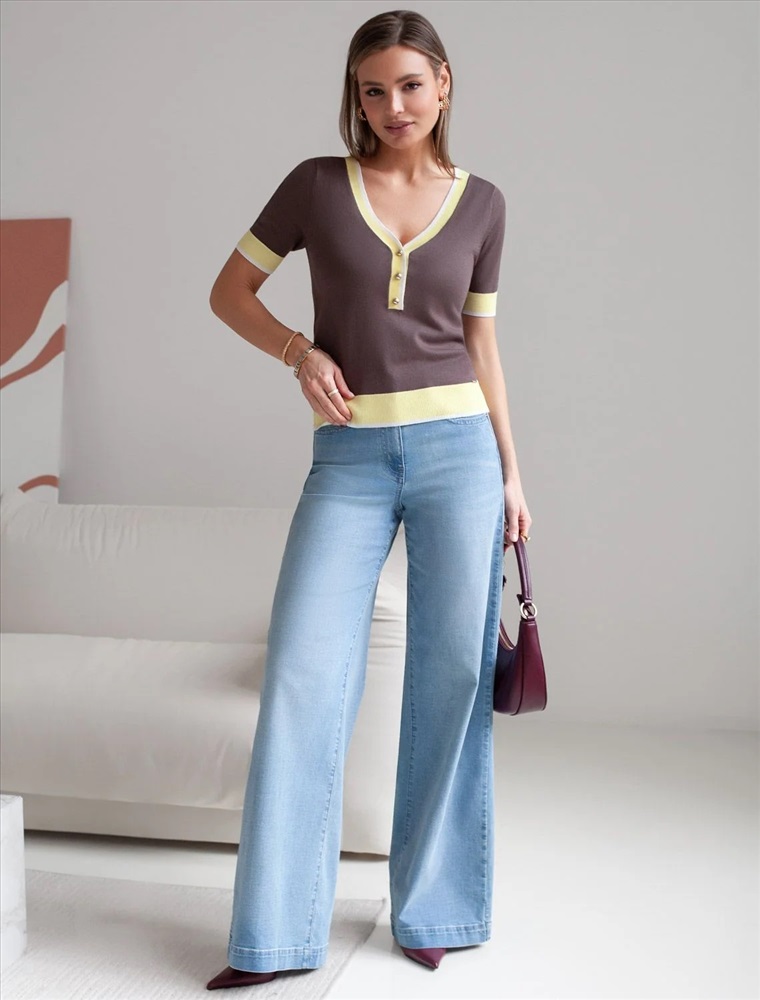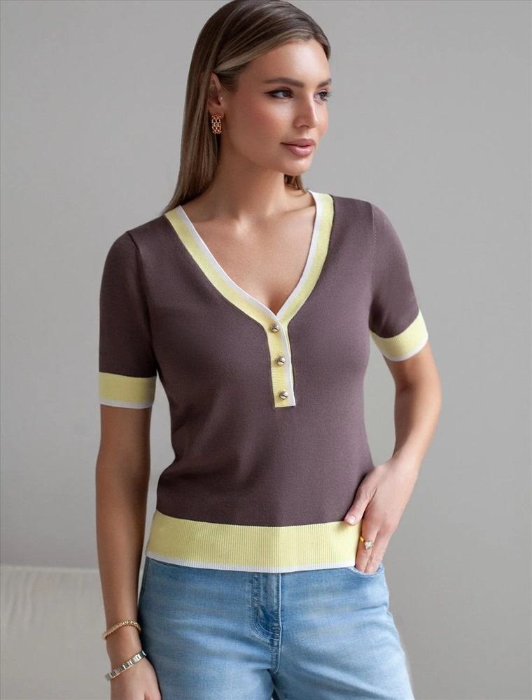 Легкий джемпер кофейного цвета с V-вырезом идеально подходит на весну и лето. Тонкая вязка из вискозы дарит приятный комфорт и ощущение свежести в теплую погоду. Полуприлегающий крой подчеркивает силуэт, а универсальная длина позволяет сочетать джемпер с разными элементами гардероба. V-вырез с пуговицами подчеркивает зону декольте и визуально вытягивает шею, делая фигуру более изящной. Контрастная отделка добавляет стильный акцент, создавая выразительный образ. Джемпер отлично смотрится на больших размерах благодаря продуманному крою и полуприлегающему фасону. Этот джемпер с коротким рукавом станет незаменимой частью гардероба в сезоны, когда хочется легкости и элегантности одновременно. Лаконичный дизайн обеспечивает простоту комбинирования с другими вещами и будет универсальной базой для создания разнообразных комплектов — от офисного до непринужденного городского стиля.