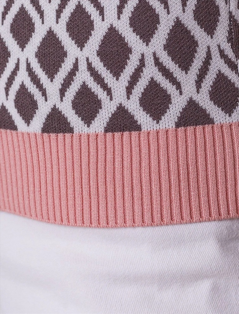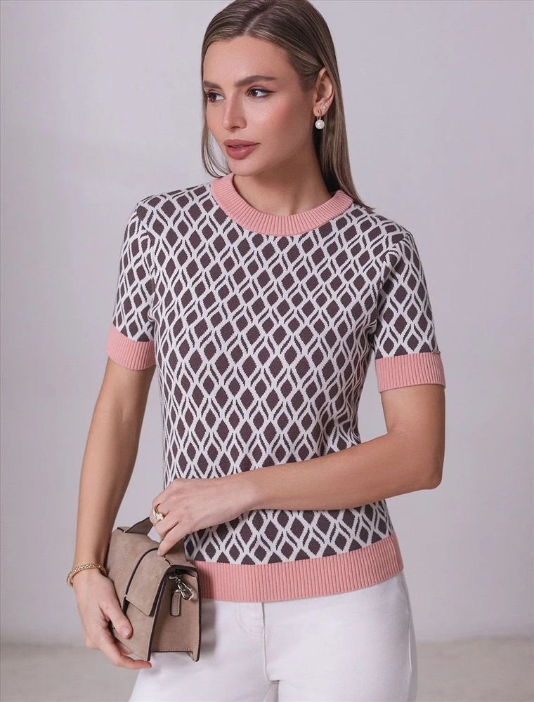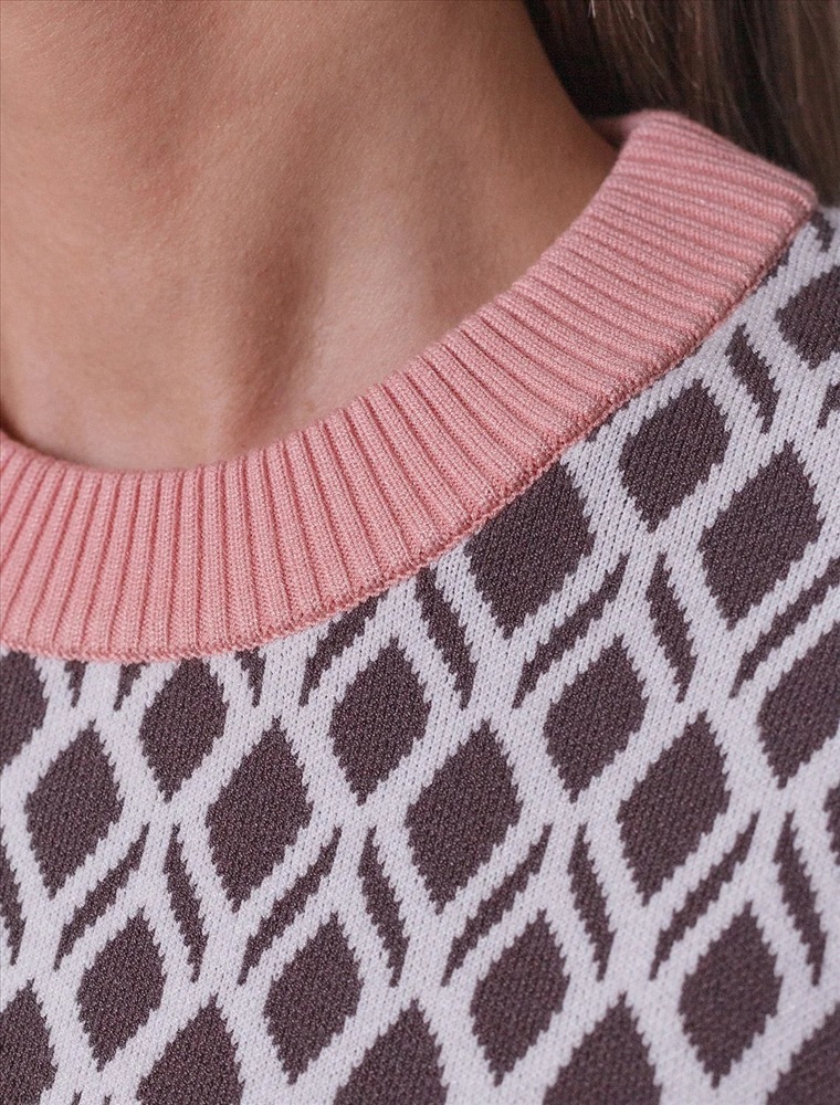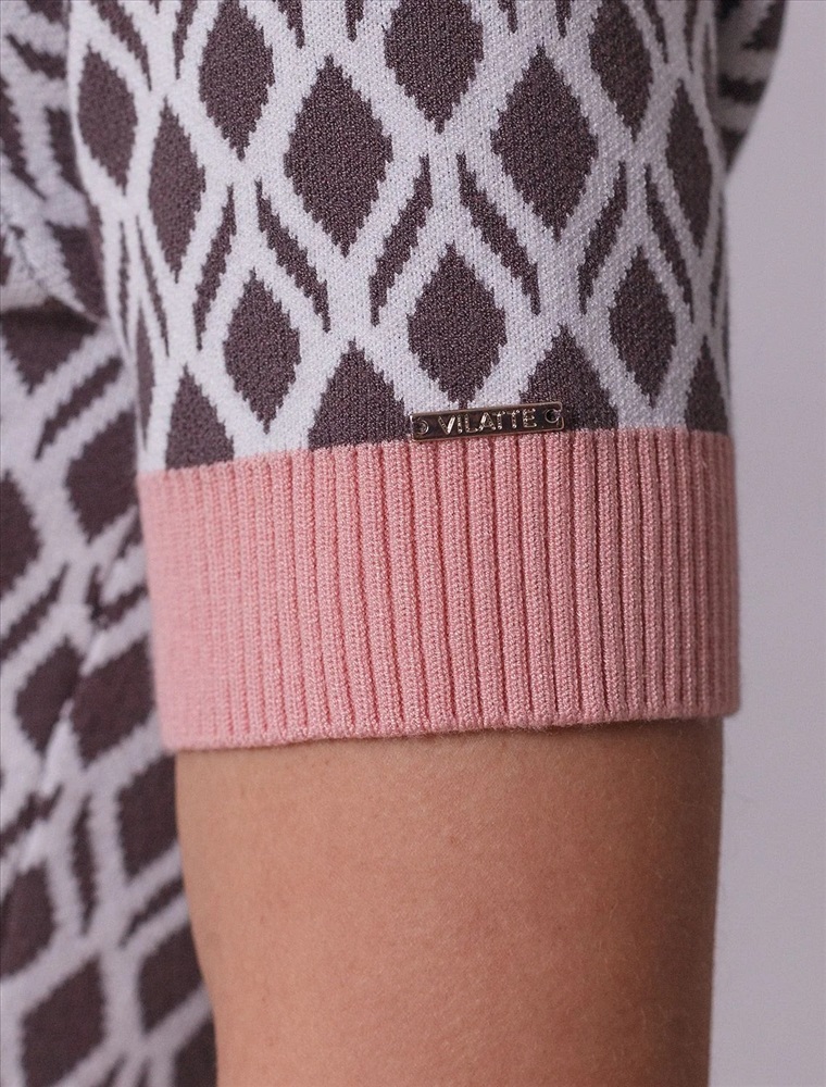 Джемпер с коротким рукавом жаккардовой вязки — универсальная и стильная вещь для весны и лета. Джемпер кофейно-белого цыета выполнен из приятной к телу вискозы, которая дарит ощущение комфорта даже в теплую погоду, а качественная жаккардовая вязка сохраняет форму после стирки. Контрастная отделка гармонично сочетается с выразительным геометрическим рисунком, который придает образу индивидуальность и современность. Принт немного напоминает благородный орнамент аргайл. Вискоза Джемпер отлично смотрится на больших размерах благодаря продуманному крою и полуприлегающему фасону. Этот джемпер с коротким рукавом станет незаменимой частью гардероба в сезоны, когда хочется легкости и стиля одновременно.
