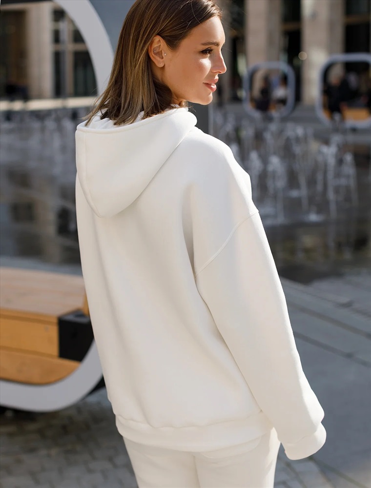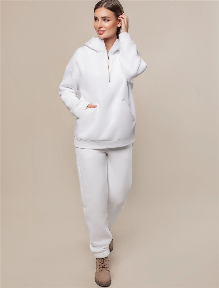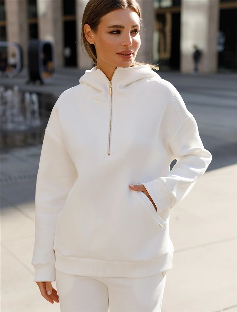 Худи с воротом на молнии выполнено из премиального футера трехнитки с теплым начесом. Модель дополнена боковыми карманами и золотистой фурнитурой, что поддерживает актуальный стиль спорт-шик. Свободный крой подходит для любой фигуры. Ранней осенью или поздней весной можно носить в качестве верхней одежды. Сочетается в костюме с брюками D44.133