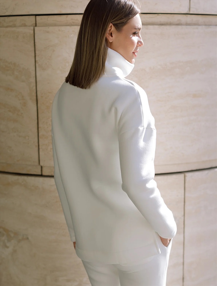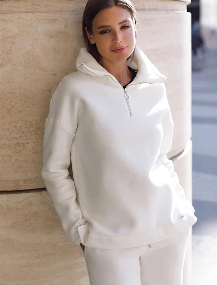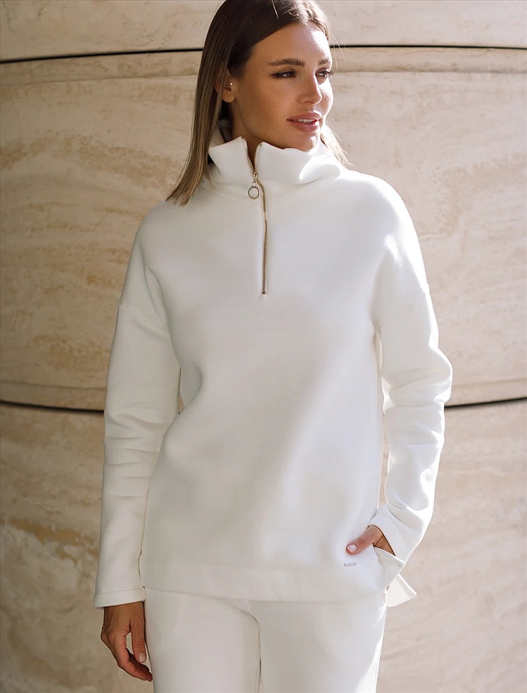 Джемпер с воротом стойкой на молнии выполнен из премиального футера трехнитки с теплым начесом. Модель дополнена золотистой фурнитурой, что поддерживает актуальный стиль спорт-шик. Свободный крой подходит для любой фигуры. Ранней осенью или поздней весной можно носить в качестве верхней одежды. Сочетается в костюме с брюками D44.133.