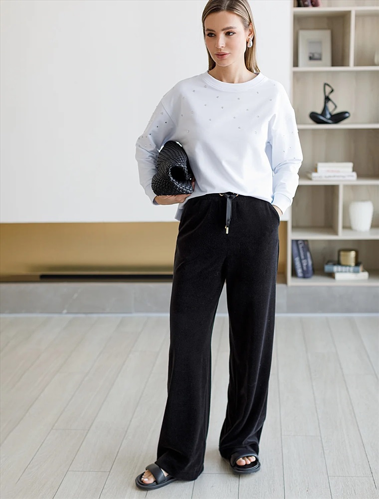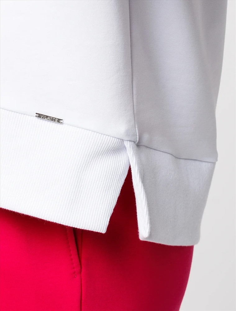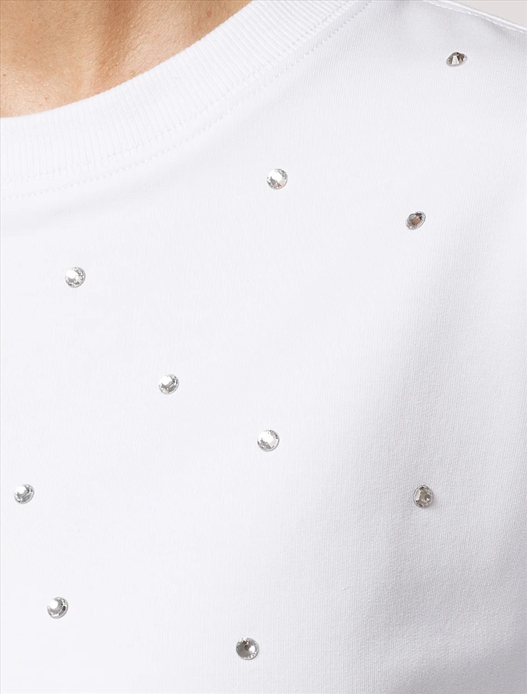 Свитшот выполнен из эластичного футера двухнитки. Изделие дополнили лаконичным принтом стразами в тон изделия. Расслабленный стиль поддерживает спущенная линия плеча, свободный силуэт и разрезы по бокам. Модель сочетается в костюме с брюками D44.135, D44.136, D44.137 и юбкой D46.034