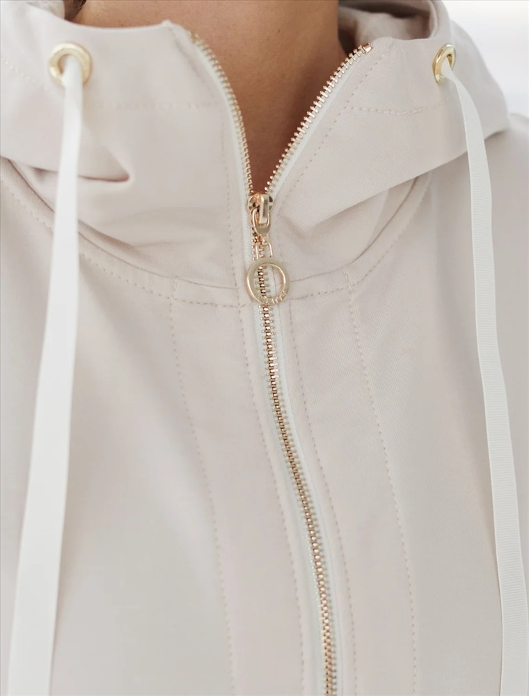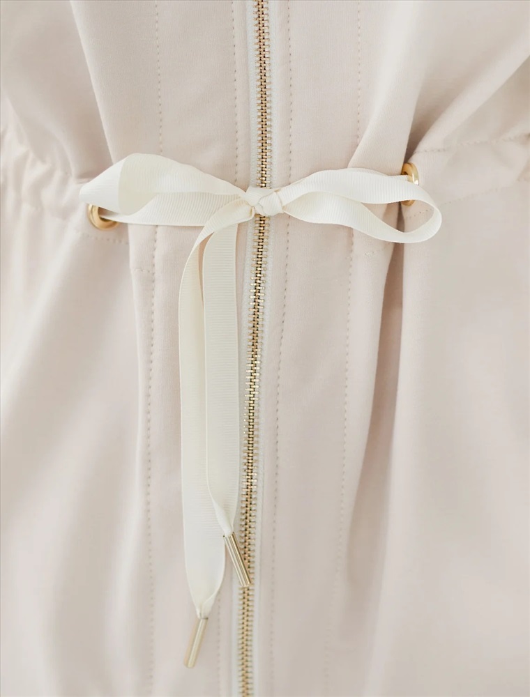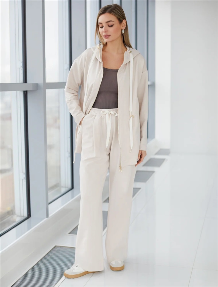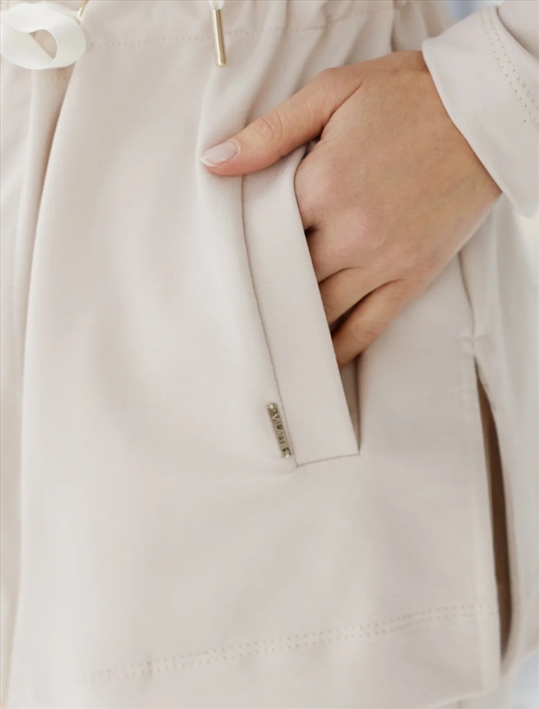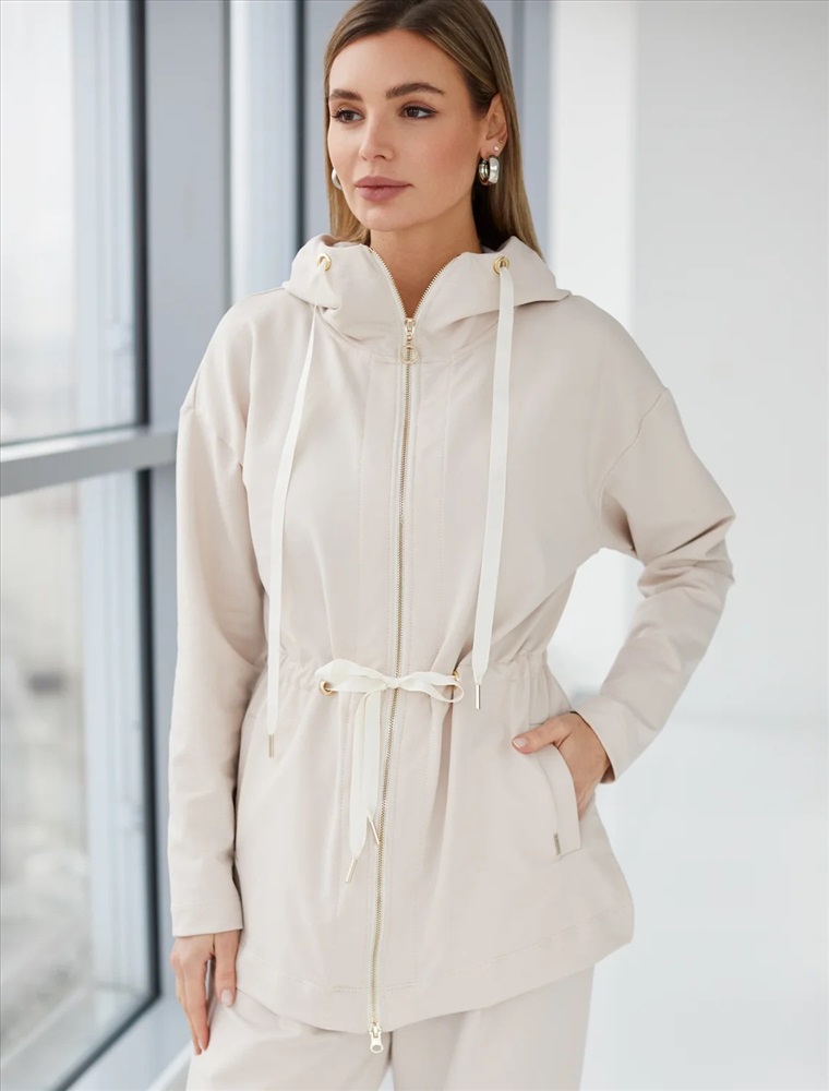 Парка выполнена из эластичного футера-двухнитки. Модель дополнена регулируемым шнуром из репсовой ленты на талии, застежкой на молнию и боковыми карманами. За счет наличия эластана, ткань хорошо держит форму, не вытягивается и гарантирует абсолютный комфорт. В теплое время года с легкостью заменит верхнюю одежду. Сочетается в костюме с брюками D44.140 и D44.14