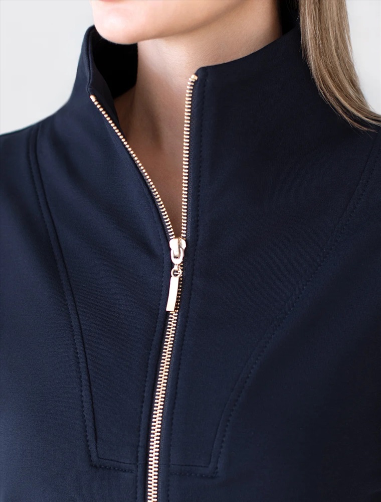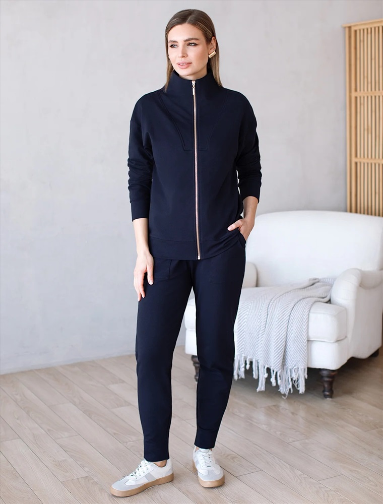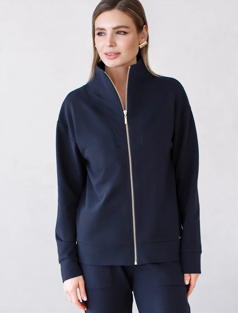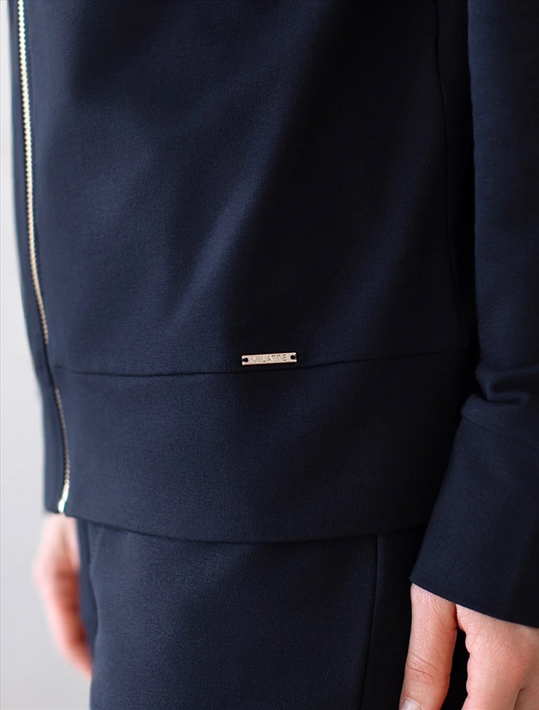 Жакет выполнен из футера двухнитки с эластаном. Модель без карманов с воротом стойка и застежкой на молнию золотистого цвета. Эластичный материал гарантирует комфорт и формоустойчивость. Сочетается в костюме с брюками D44.138, D44.139 и шортами D48.008. Изделие дополнено металлическим логотипом бренда.