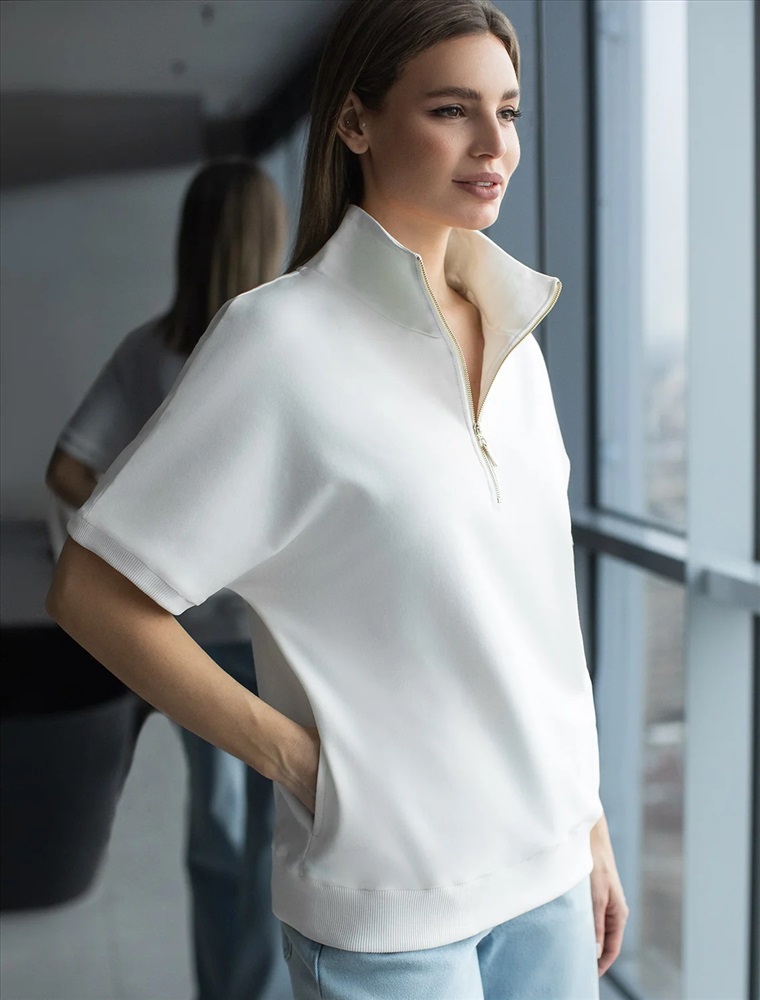Джемпер среднего объема со спущенным плечом выполнен из футера двухнитки с эластаном. Изделие с воротом на золотистой молнии дополнено боковыми карманами. Эластичный материал гарантирует комфорт и формоустойчивость. Сочетается в костюме с брюками D44.138, D44.139 и шортами D48.008. Изделие дополнено металлическим логотипом бренда.