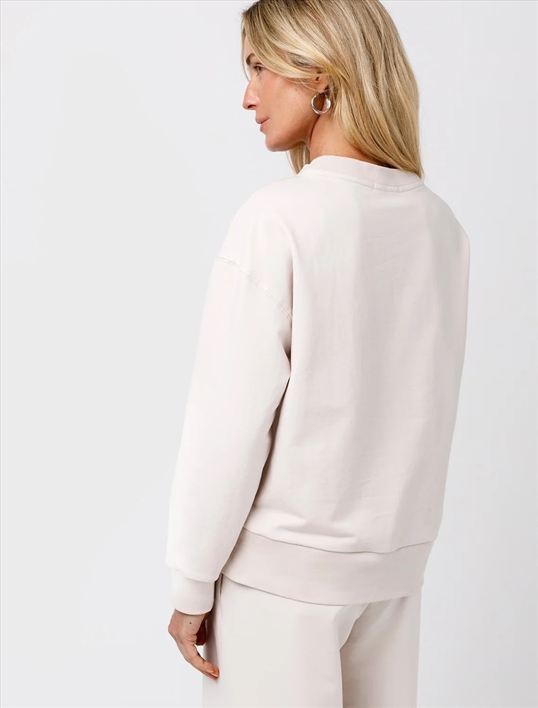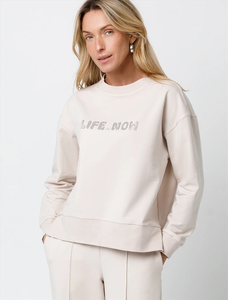 Свитшот выполнен из эластичного футера двухнитки. Изделие дополнили аппликацией из металлических страз. Перевод: Life is now - живи сейчас. Расслабленный стиль поддерживает спущенная линия плеча, свободный силуэт и разрезы по бокам.