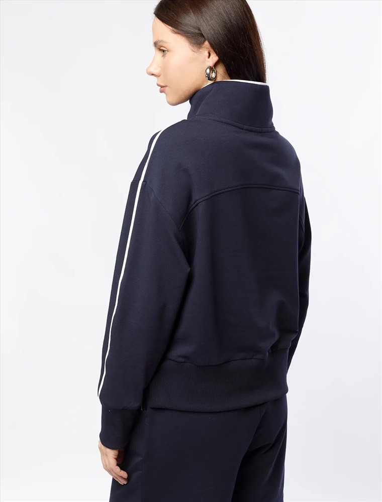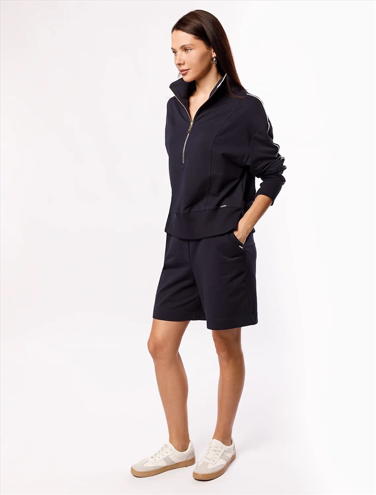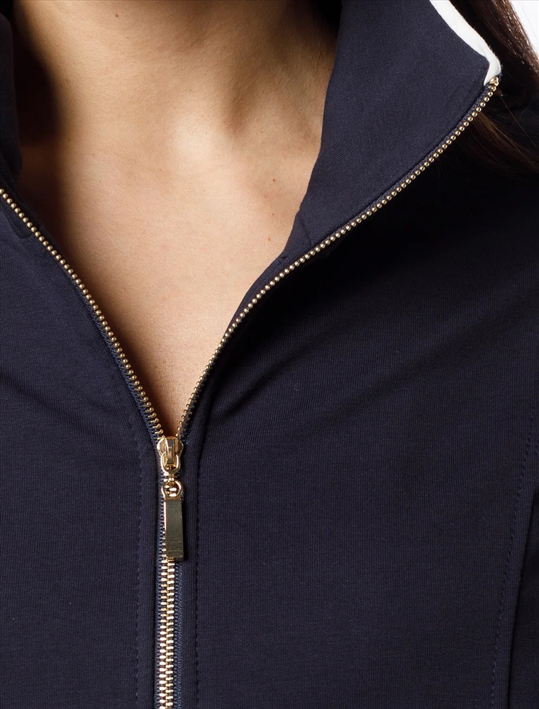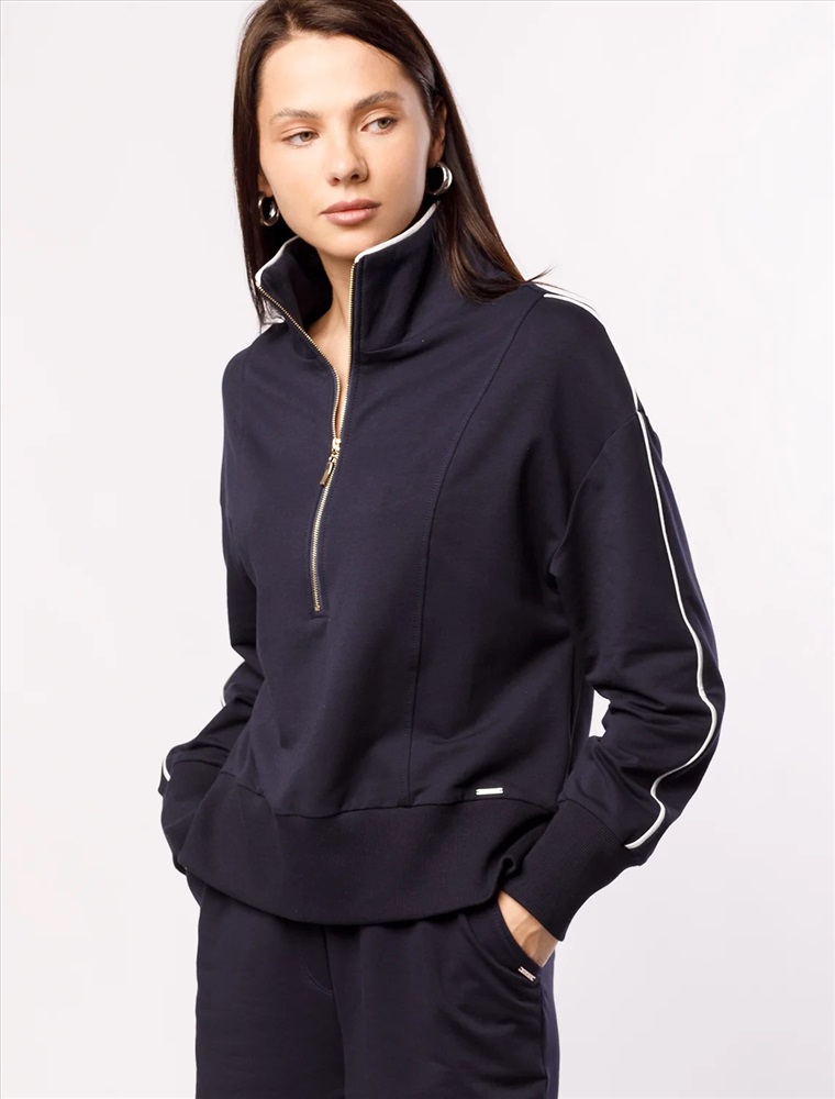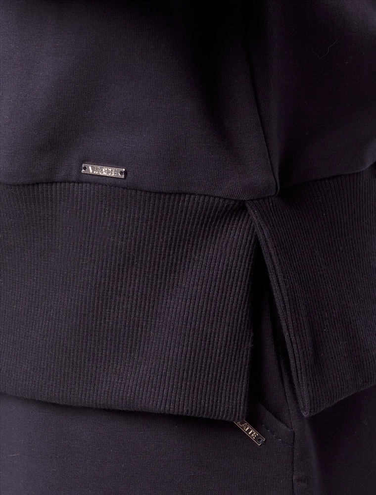 Джемпер с воротом на молнии выполнен из эластичного футера двухнитки. Модель умеренно свободного кроя. По рукавам и воротнику кант из футера контрасного цвета. Изделие дополнено золотистым логотипом бренда. Сочетается в костюме с брюками D44.141, D44.142, шортами D48.009 и юбкой-шортами D46.041