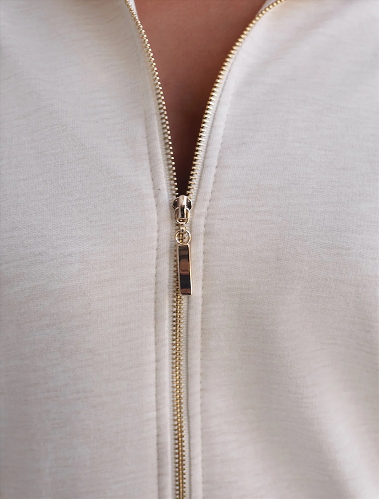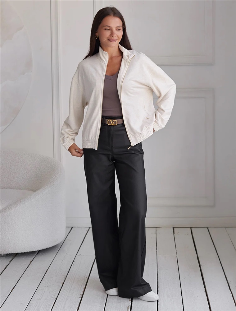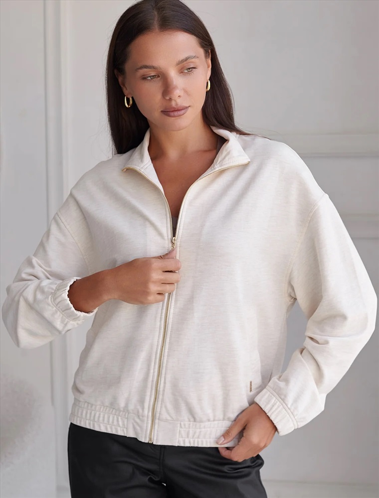 Свободный бомбер бежевого цвета с эффектом меланж на молнии выполнен из премиального футера двухнитки без начеса, обеспечивает мягкость и комфорт при носке. Натуральный состав обеспечивает дышащий эффект, мягкость и приятные тактильные ощущения, Эластичный материал позволяет свободно двигаться без лишнего стеснения, а также отлично сохраняет форму даже после длительного ношения. Высокий воротник, манжеты на рукавах и резинка по низу обеспечивают надежную посадку, сохраняя тепло в прохладную погоду. Оверсайз бомбер отличается спущенной линией плеч и универсальной длиной, которая идеально подходит для повседневного и спортивного образа. Прорезные карманы по бокам добавляют функциональности, сохраняя при этом стильный внешний вид. Бомбер из футера украшен деликатной вышивкой в виде эмблемы бренда, которая придает особый шарм и подчеркивает индивидуальность владелицы. Такой изысканный элемент декора гармонично сочетается с лаконичным дизайном, отвечая современным тенденциям моды. Так же на одном из карманов ра
