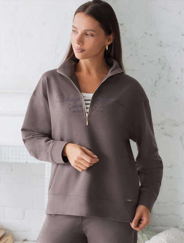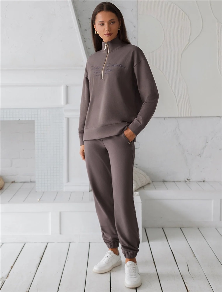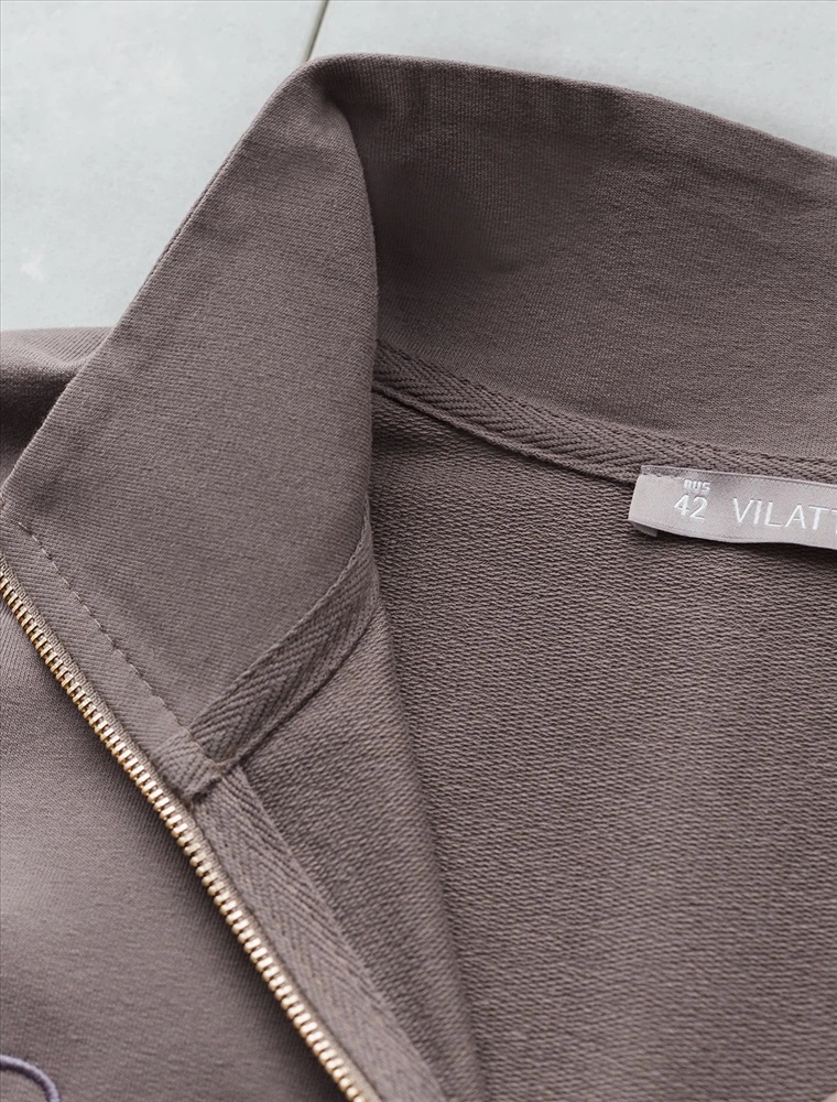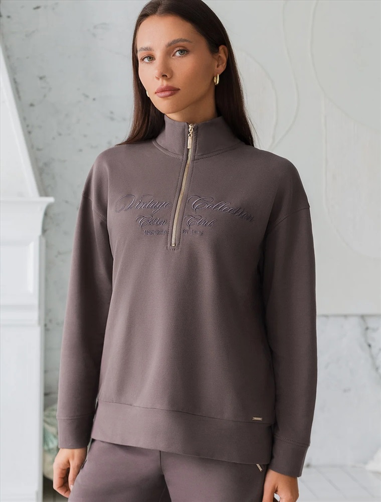Уютный и комфортный вариант для прохладной погоды – стильный джемпер кофейного цвета с воротом на молнии. Изготовлен из премиального футера трехнитки с добавлением эластана. Материал сохраняет форму при длительном ношении и после многократных стирок, его мягкая текстура дарит ощущение уюта и тепла. Минималистичная вышивка в тон изделия в виде надписи. еревод надписи: Vinlage collection cotton club - Винтажная коллекция Хлопковый клуб. Свободный крой джемпера позволяет не ограничивать движения, что особенно важно для активного образа жизни. Подойдет на любую женскую фигуру, представлена широкая размерная линейка, большие размеры, легко комбинируется с другими вещами, создавая модные образы в стиле спорт-шик. Этот повседневный джемпер сочетает в себе удобство и актуальность, будет универсальным выбором для отдыха или прогулок.