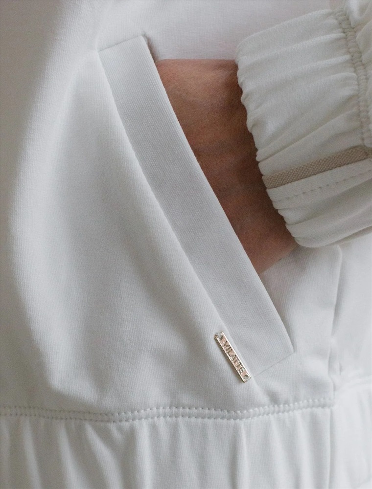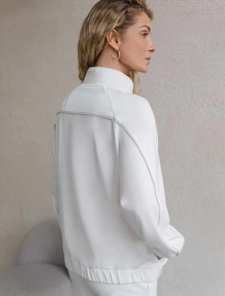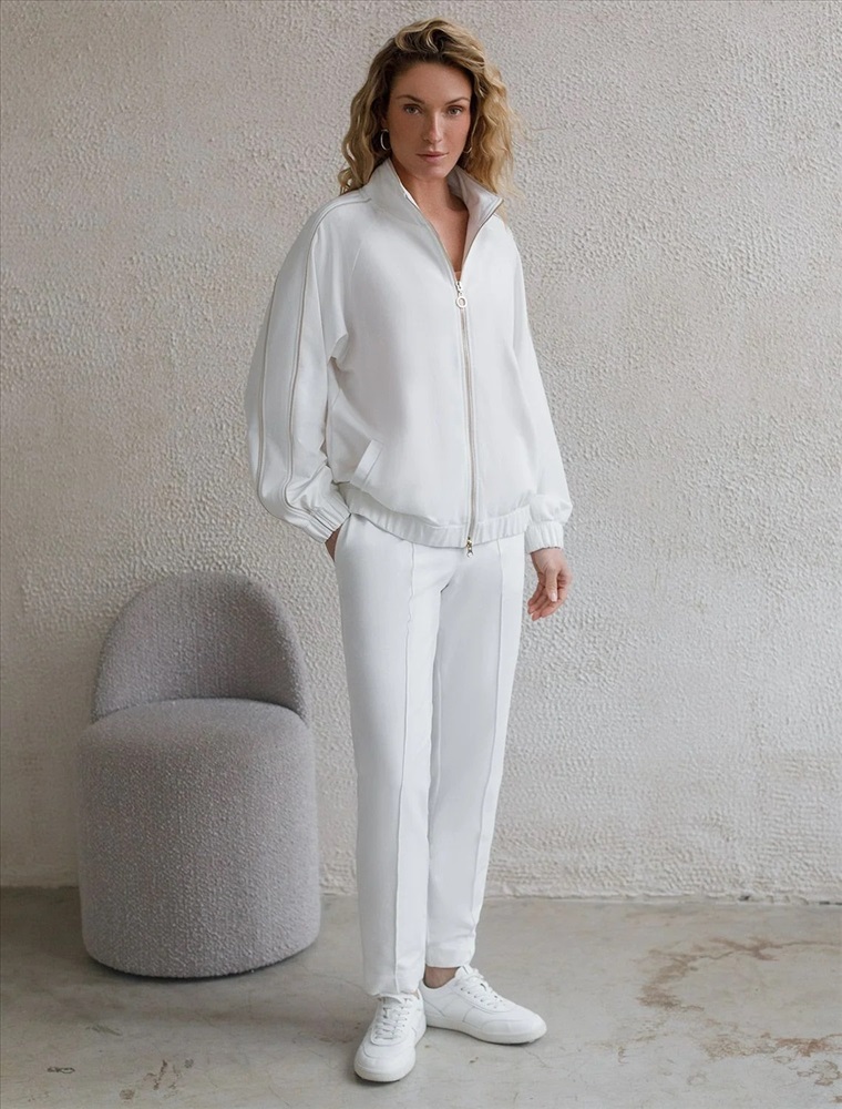 Свободный бомбер белого цвета на молнии выполнен из премиального футера двухнитки плотностью 240 Г/м2. Натуральный состав обеспечивает хорошую воздухопроницаемость, мягкость и приятные тактильные ощущения, Эластичный материал олимпийки позволяет свободно двигаться без лишнего стеснения, а также отлично сохраняет форму даже после длительного ношения. Манжеты на рукавах и резинка по низу обеспечивают надежную посадку, сохраняя тепло в прохладную погоду. Повседневный бомбер отличается универсальной длиной, которая идеально подходит для повседневного и спортивного образа. Контрастные лампасы на рукавах придают образу динамику и визуально вытягивают силуэт, делая модель актуальной. Прорезные карманы по бокам добавляют функциональности, сохраняя при этом стильный внешний вид. Представленная размерная линейка позволяет подобрать оптимальный вариант для любой фигуры и размера, на маленький или плюс сайз, обеспечивая идеальную посадку без компромиссов по стилю. Эта зипка на молнии станет отличным дополнением к базовому гардеробу, сочетая практичность с элегантностью.