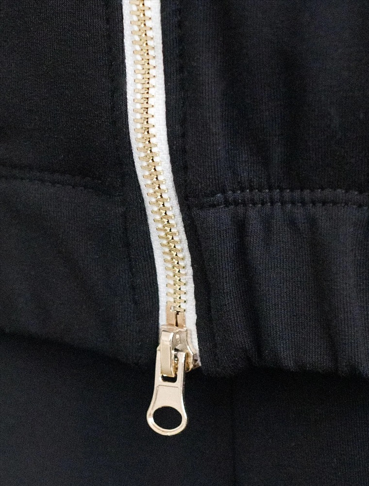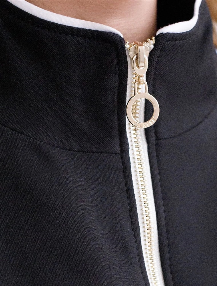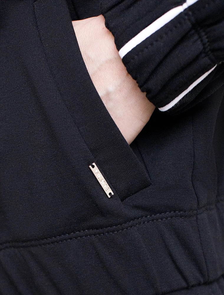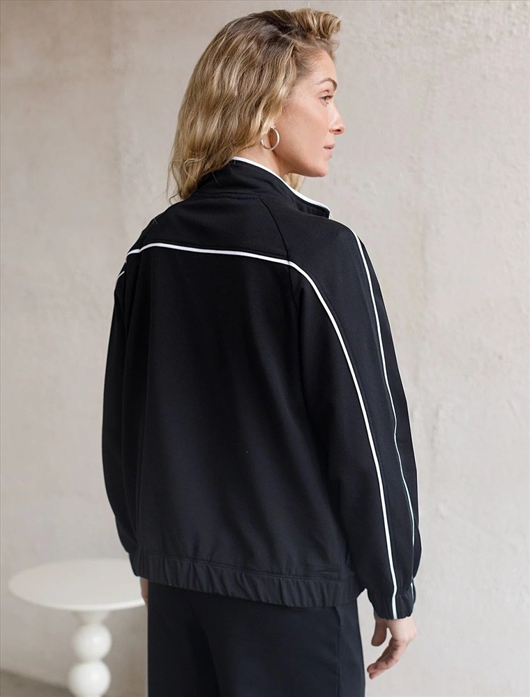 Свободный бомбер черного цвета на молнии выполнен из премиального футера двухнитки плотностью 240 Г/м2. Натуральный состав обеспечивает хорошую воздухопроницаемость, мягкость и приятные тактильные ощущения, Эластичный материал олимпийки позволяет свободно двигаться без лишнего стеснения, а также отлично сохраняет форму даже после длительного ношения. Манжеты на рукавах и резинка по низу обеспечивают надежную посадку, сохраняя тепло в прохладную погоду. Повседневный бомбер отличается универсальной длиной, которая идеально подходит для повседневного и спортивного образа. Контрастные лампасы на рукавах придают образу динамику и визуально вытягивают силуэт, делая модель актуальной. Прорезные карманы по бокам добавляют функциональности, сохраняя при этом стильный внешний вид. Представленная размерная линейка позволяет подобрать оптимальный вариант для любой фигуры и размера, на маленький или плюс сайз, обеспечивая идеальную посадку без компромиссов по стилю. Эта зипка на молнии станет отличным дополнением к базовому гардеробу, сочетая практичность с элегантностью.