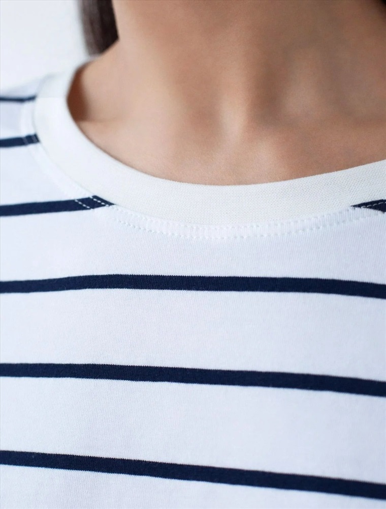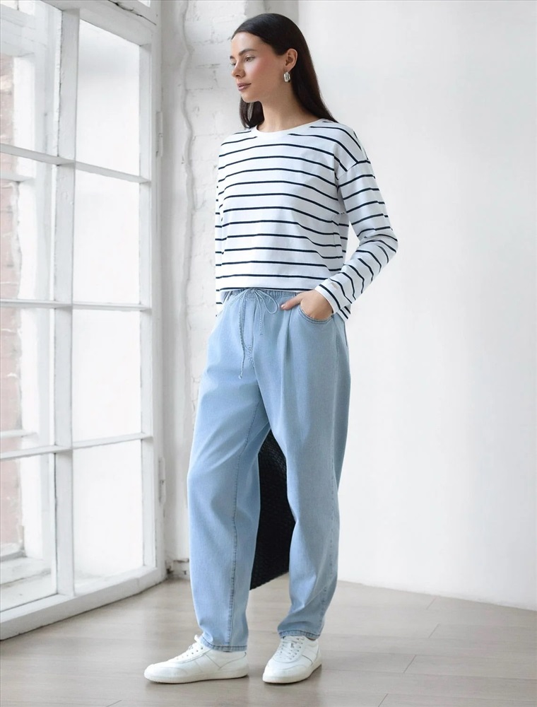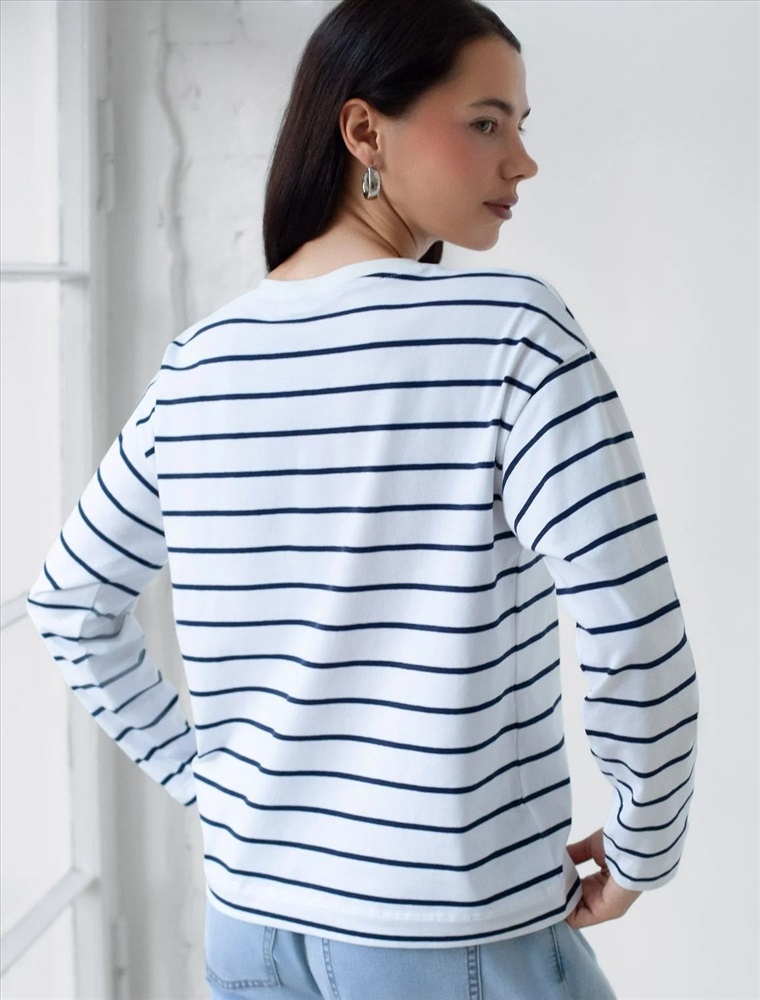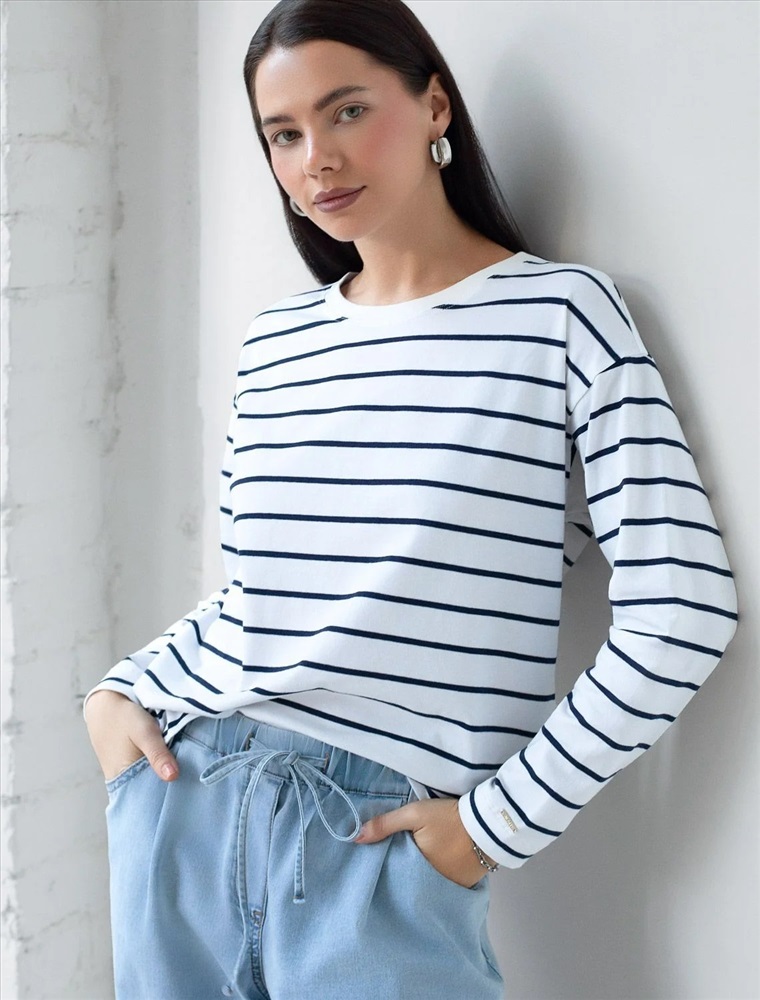 Свободный лонгслив белого цвета в темно-синюю полоску с длинным рукавом выполнен из премиального хлопка с добавлением эластана, плотностью 170 Г/м2, что обеспечивает комфорт и приятные тактильные ощущения. Принт полоска - придает изделию легкую текстурность и стильный вид, а круглый ворот создает универсальный образ, который подойдет для повседневного использования. Такой лонгслив идеально подходит для весеннего и летнего сезона благодаря легкой и дышащей ткани. Представленная широкая размерная линейка позволяет выбрать оптимальный вариант на любую фигуру, в том числе на плюс-сайз, обеспечивая свободу движений и удобство на каждый день. Этот комфортный лонгслив станет отличной базой в гардеробе, сочетаясь с различными стилями одежды и создавая простой, но эффектный образ.