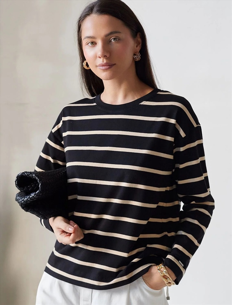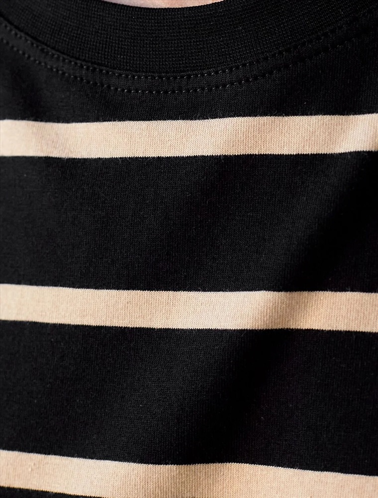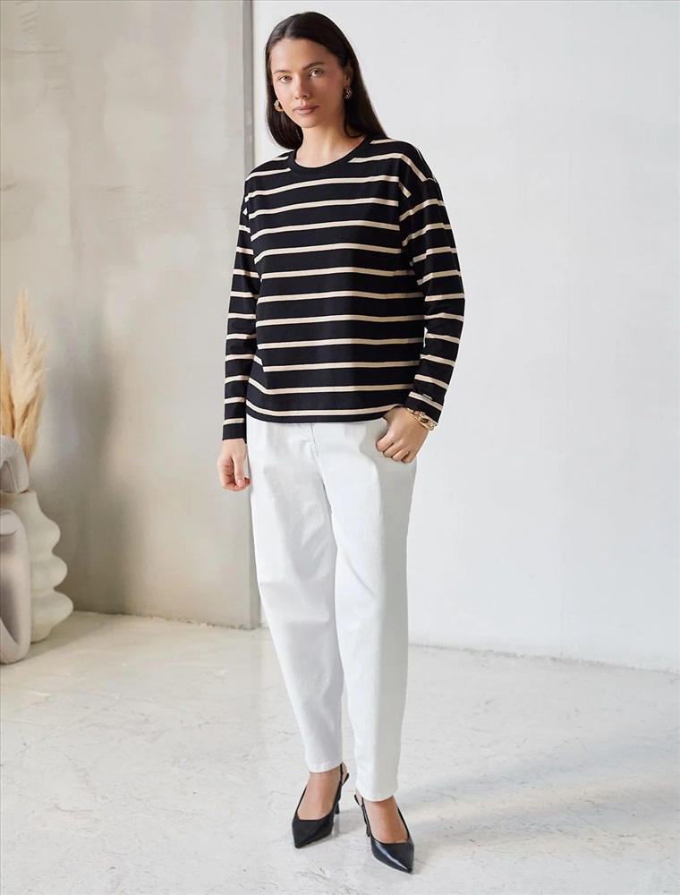Свободный лонгслив черного цвета в бежевую полоску с длинным рукавом выполнен из премиального хлопка с добавлением эластана, плотностью 170 Г/м2, что обеспечивает комфорт и приятные тактильные ощущения. Принт полоска - придает изделию легкую текстурность и стильный вид, а круглый ворот создает универсальный образ, который подойдет для повседневного использования. Такой лонгслив идеально подходит для весеннего и летнего сезона благодаря легкой и дышащей ткани. Представленная широкая размерная линейка позволяет выбрать оптимальный вариант на любую фигуру, в том числе на плюс-сайз, обеспечивая свободу движений и удобство на каждый день. Этот комфортный лонгслив станет отличной базой в гардеробе, сочетаясь с различными стилями одежды и создавая простой, но эффектный образ.