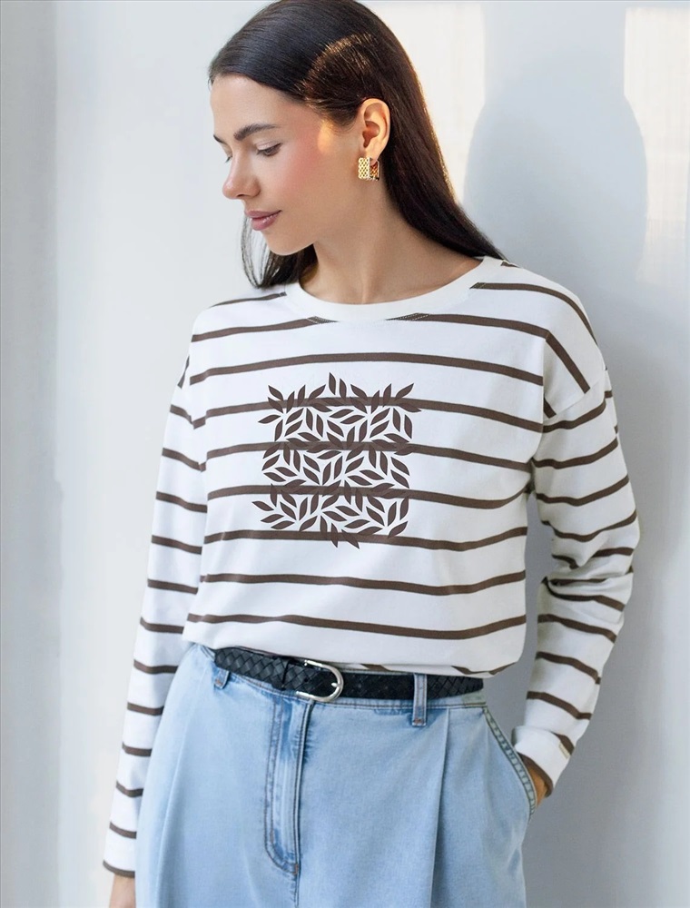 Свободный лонгслив белого цвета в кофейную полоску с длинным рукавом выполнен из премиального хлопка с добавлением эластана, плотностью 170 Г/м2, что обеспечивает комфорт и приятные тактильные ощущения. Полоска - придает изделию легкую текстурность, принт в виде листиков, который нанесен красками с устойчивым покрытием, добавляет стиля и индивидуальности, а круглый ворот создает универсальный образ, который подойдет для повседневного использования. Такой лонгслив идеально подходит для весеннего и летнего сезона благодаря легкой и дышащей ткани. Представленная широкая размерная линейка позволяет выбрать оптимальный вариант на любую фигуру, в том числе на плюс-сайз, обеспечивая свободу движений и удобство на каждый день. Этот комфортный лонгслив станет отличной базой в гардеробе, сочетаясь с различными стилями одежды и создавая простой, но эффектный образ.