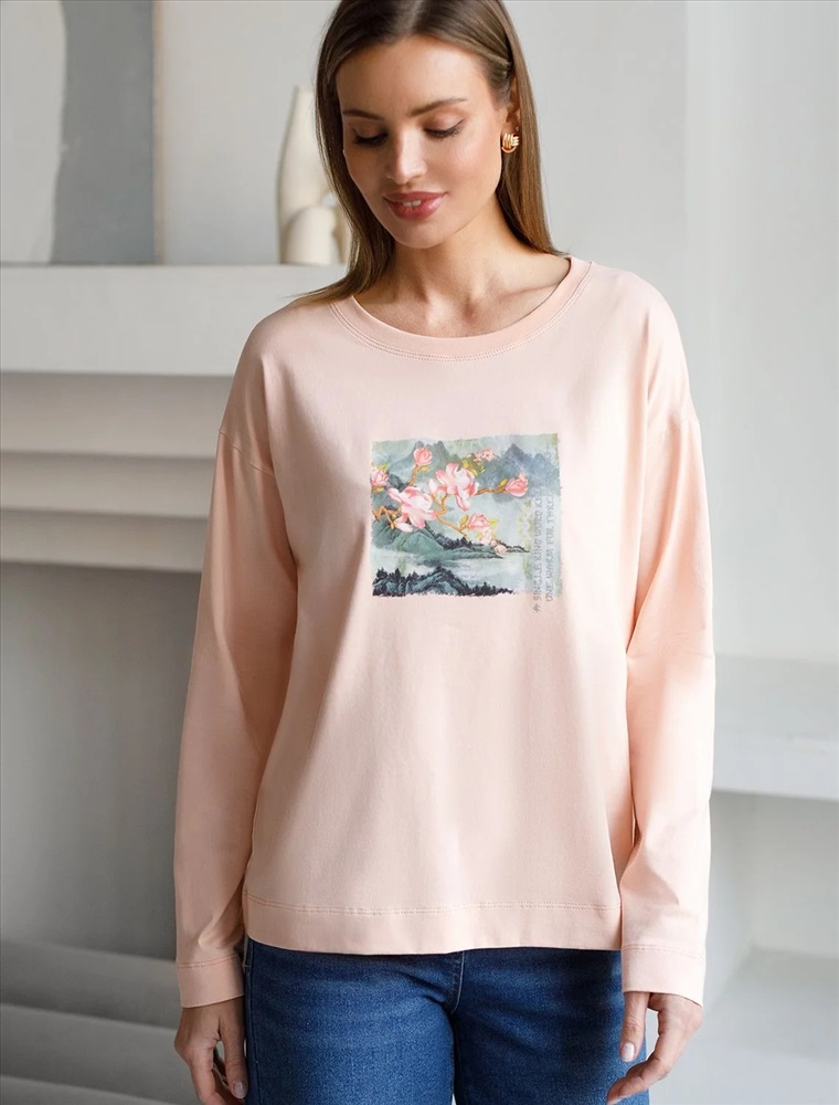Свободный однотонный лонгслив пудрового цвета с длинным рукавом выполнен из премиального хлопка с добавлением эластана, плотностью 170 Г/м2, что обеспечивает комфорт и приятные тактильные ощущения. Принт в виде пейзажа, который нанесен красками с устойчивым покрытием, добавляет стиля и индивидуальности, а круглый ворот создает универсальный образ, который подойдет для повседневного использования. Такой лонгслив идеально подходит для весеннего и летнего сезона благодаря легкой и дышащей ткани. Представленная широкая размерная линейка позволяет выбрать оптимальный вариант на любую фигуру, в том числе на плюс-сайз, обеспечивая свободу движений и удобство на каждый день. Этот комфортный лонгслив станет отличной базой в гардеробе, сочетаясь с различными стилями одежды и создавая простой, но эффектный образ.