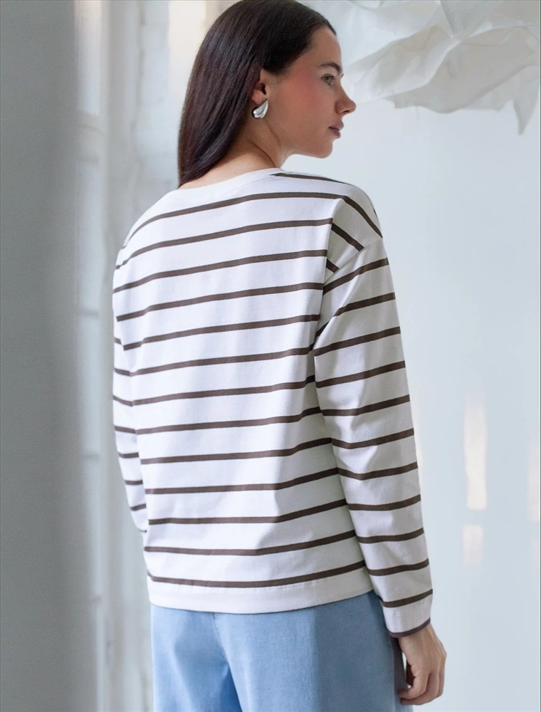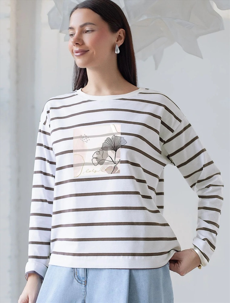 Свободный лонгслив белого цвета в кофейную полоску с длинным рукавом выполнен из премиального хлопка с добавлением эластана, плотностью 170 Г/м2, что обеспечивает комфорт и приятные тактильные ощущения. Полоска - придает изделию легкую текстурность, принт в виде цветка, который нанесен красками с устойчивым покрытием, добавляет стиля и индивидуальности, а круглый ворот создает универсальный образ, который подойдет для повседневного использования. Такой лонгслив идеально подходит для весеннего и летнего сезона благодаря легкой и дышащей ткани. Представленная широкая размерная линейка позволяет выбрать оптимальный вариант на любую фигуру, в том числе на плюс-сайз, обеспечивая свободу движений и удобство на каждый день. Этот комфортный лонгслив станет отличной базой в гардеробе, сочетаясь с различными стилями одежды и создавая простой, но эффектный образ.