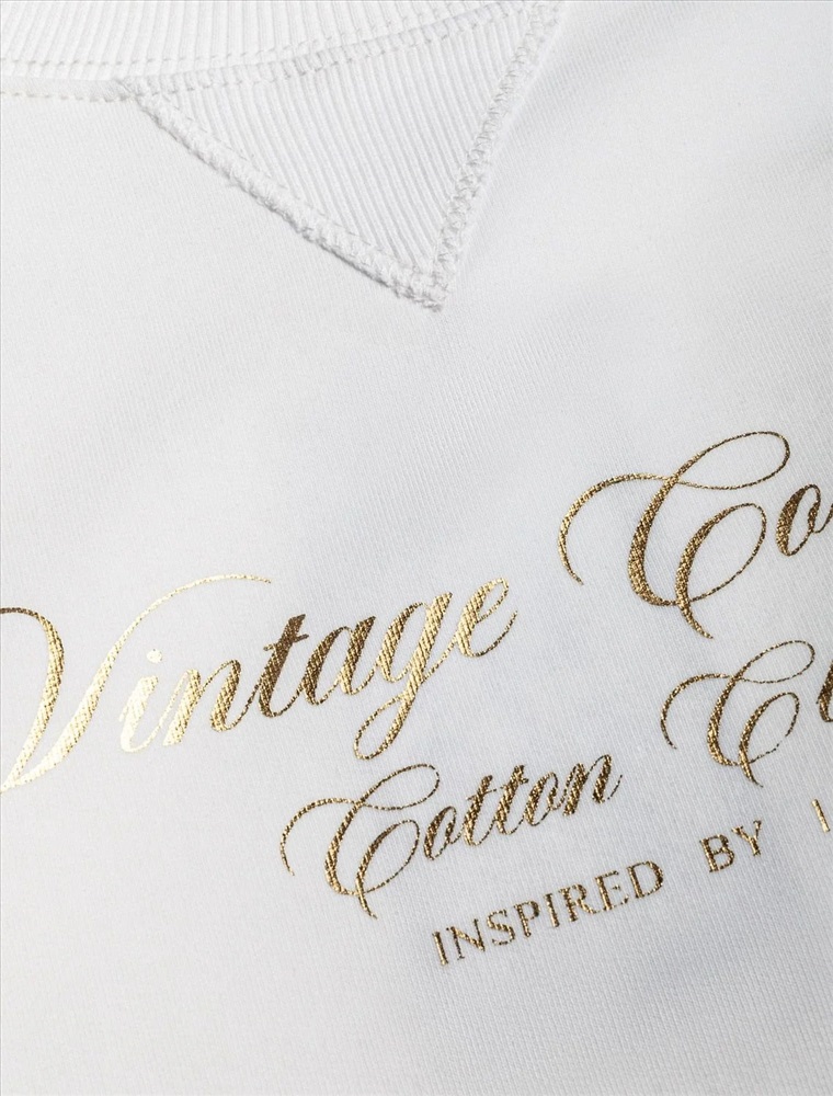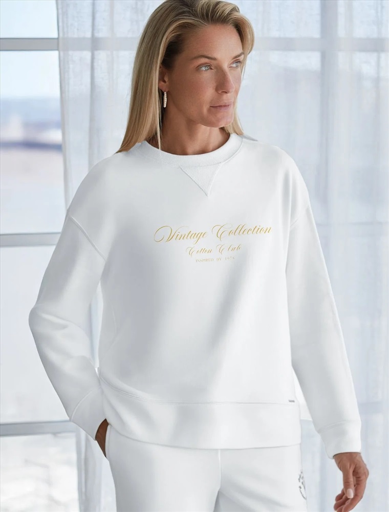 Стильный свитшот белого цвета из премиального футера двухнитки с эластаном сочетает в себе комфорт и оригинальность. Джемпер выполнен из натурального хлопка, который обеспечивает мягкость и дышащие свойства ткани. Нежный материал дарит ощущение уюта в любое время года, а премиальное качество изготовления гарантирует долговечность и сохранение формы после множества стирок. Особенность изделия — спущенная линия плеча и аккуратные разрезы, которые добавляют современный акцент и делают образ более выразительным. Принт в виде надписи придает индивидуальность, позволяя выделиться без лишней вычурности. Перевод надписи Vintage collection Cotton club Inspired by 1978 - Винтажная коллекция Cotton Club, вдохновленная 1978 годом. Дополнен металлическим логотипом бренда. Представлена широкая размерная линейка, включая маленькие и большие размеры, что позволяет подобрать идеальный вариант для разной фигуры и роста. Этот уютный свитшот отлично подходит для повседневной носки благодаря своей комфортной посадке и мягкой текстуре. Он станет универсальным элементом гардероба, легко сочетающимся с различными стилями одежды. Свободный джемпер из футера станет отличным выбором для активного отдыха, обеспечивая стильный внешний вид и удобство весной, летом и любое другое время года.