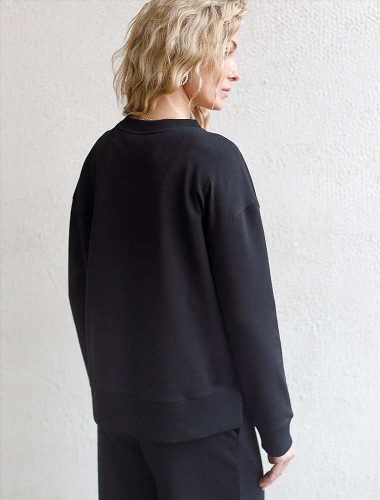 Стильный свитшот черного цвета из премиального футера двухнитки с эластаном сочетает в себе комфорт и оригинальность. Джемпер выполнен из натурального хлопка, который обеспечивает мягкость и дышащие свойства ткани. Нежный материал дарит ощущение уюта в любое время года, а премиальное качество изготовления гарантирует долговечность и сохранение формы после множества стирок. Особенность изделия — спущенная линия плеча и аккуратные разрезы, которые добавляют современный акцент и делают образ более выразительным. Принт в виде надписи придает индивидуальность, позволяя выделиться без лишней вычурности. Перевод надписи Athleisure mood club - Клуб спортивного настроения. Дополнен металлическим логотипом бренда. Представлена широкая размерная линейка, включая маленькие и большие размеры, что позволяет подобрать идеальный вариант для разной фигуры и роста. Этот уютный свитшот отлично подходит для повседневной носки благодаря своей комфортной посадке и мягкой текстуре. Он станет универсальным элементом гардероба, легко сочетающимся с различными стилями одежды. Свободный джемпер из футера станет отличным выбором для активного отдыха, обеспечивая стильный внешний вид и удобство весной, летом или в прохладную погоду.