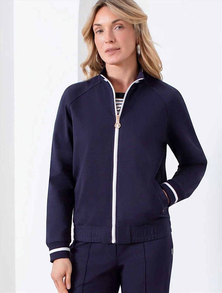 Бомбер темно-синего цвета среднего объема с застежкой на молнию выполнен из премиального футера двухнитки плотностью 240 Г/м2. Натуральный состав ткани обеспечивает дышащий эффект, мягкость и приятные тактильные ощущения, Эластичный материал позволяет свободно двигаться без стеснения, а также отлично сохраняет форму даже после длительного ношения. Гладкая лицевая сторона придает бомберу опрятный и дорогой вид. Повседневный бомбер отличается аккуратным силуэтом без лишнего объема и универсальной длиной, которая идеально подходит для повседневного образа. Манжеты на рукавах и широкая резинка по низу обеспечивают надежную посадку, сохраняя тепло в прохладную летнюю погоду. Особенность бомбера - контрастные полосы на горловине и манжетах, которые добавляют современный акцент и делают его более выразительным. Представленная размерная линейка позволяет подобрать оптимальный вариант для любой фигуры и размера, на маленький или плюс сайз, обеспечивая свободу движений без компромиссов по стилю. Этот легкий бомбер станет отличным дополнением к базовому или спортивному гардеробу, сочетая практичность и стиль.