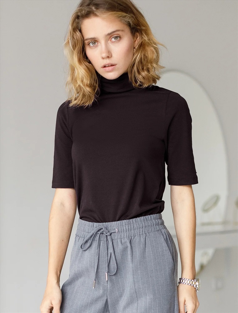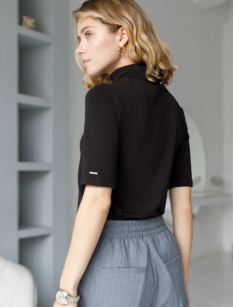 Базовая черная водолазка с коротким рукавом выполнена из премиального хлопка с добавлением эластичных волокон. Гладкий трикотаж обеспечит гарантированный комфорт и удобство в использовании. На рукаве изделия металлическая нашивка с логотипом бренда. Совет стилиста: водолазку с коротким удобно сочетать с жакетом или блузкой. Также как самостоятельный верх к широким брюкам.