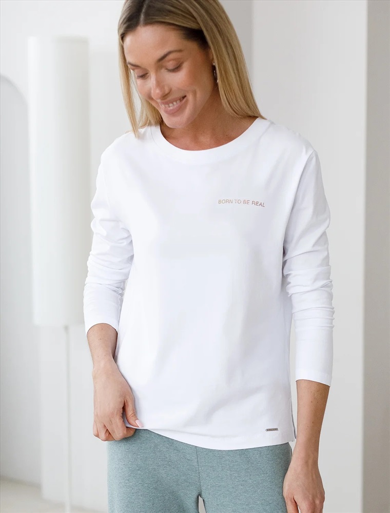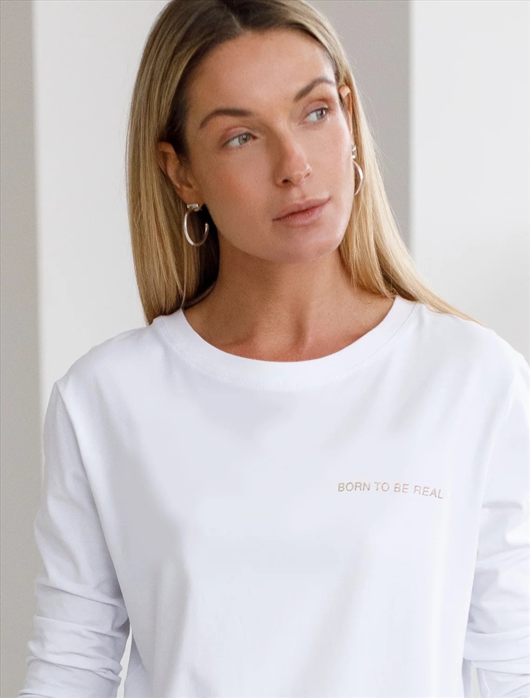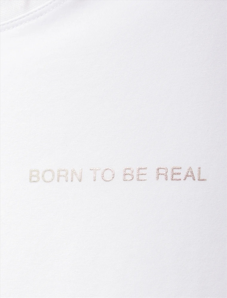 "Рождена быть настоящей", рукав "А не идеальной" Модель с лаконичным принтом серебряной фольгой с пуффом свободного силуэта со спущенной линией плеч выполнили из длинноволокнистого премиального хлопка с добавлением нитей эластана, поэтому трикотаж получился особенно мягким, шелковистым и комфортным в носке. Совет стилиста: лонгслив свободного кроя, станет яркой составляющей расслабленного повседневного образа, например, с широкими брюками и кедами.