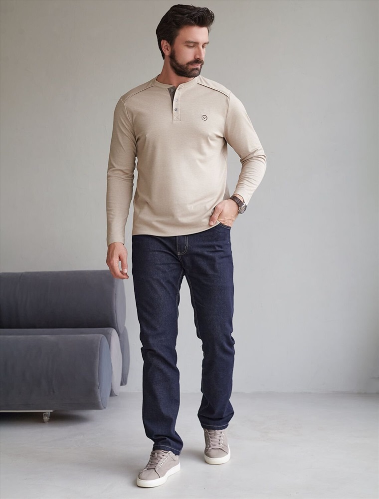 Джемпер хенли темно-бежевого цвета из полотна пике, состоящий из двух оттенков нити, создающем эффект меланж. Мягкая и дышащая ткань обеспечивает комфорт в течение всего дня, позволяя коже дышать и поддерживать оптимальную воздухопроницаемость. Материал тянется, обеспечивает долговечность и сохраняет презентабельный внешний вид даже после многократных стирок.