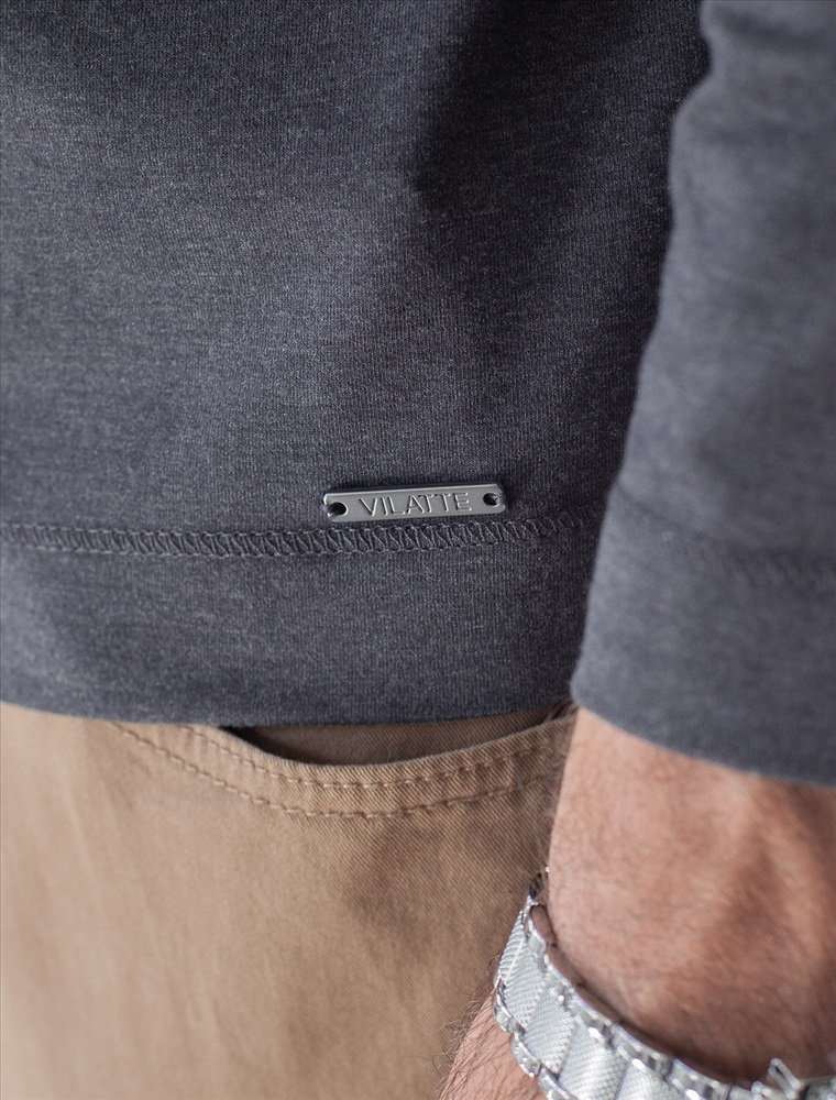 Лонгслив темно-серого цвета с эффектом меланж с длинным рукавом выполнен из премиального хлопка с эластаном, Мягкий материал обеспечивает приятные тактильные ощущения,натуральный состав ткани позволяет коже дышат, удобен в повседневной длительной носке. Благодаря эластичному материалу лонгслив тянется и создает комфортный полуприлегающий силуэт. Подходит для маленьких и больших размеров, не сковывает движения и сохраняет форму после стирки. Облегающий лонг выгодно выделяет линии тела, при этом в нем ощущается свобода движений. Круглый ворот на металлических пуговицах создает стильный образ, который легко впишется в базовый гардероб. Тонкий джемпер дополнен нашивкой из эко кожи с логотипом бренда.