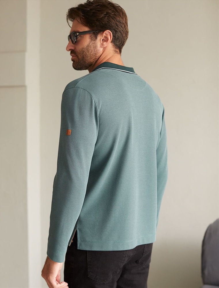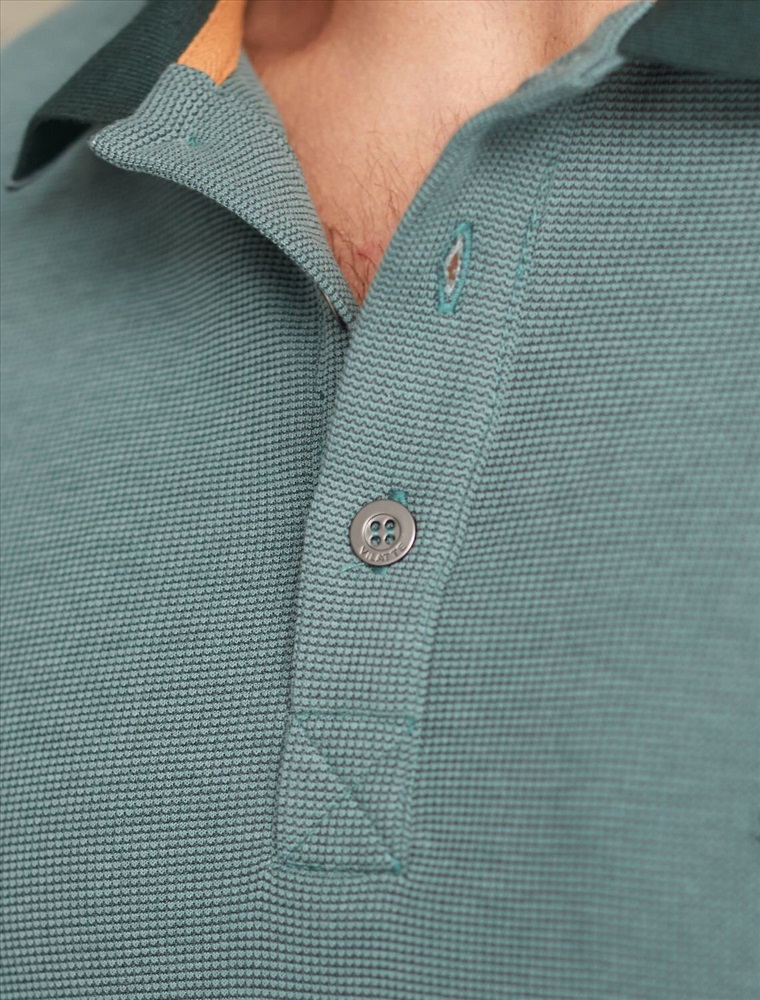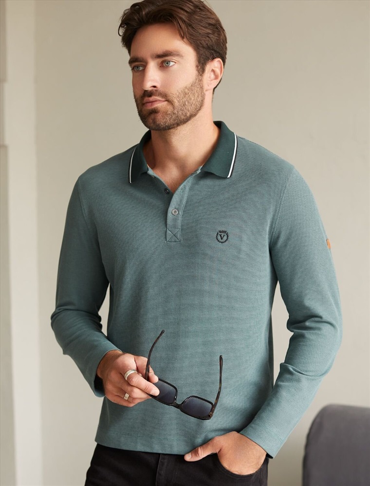 Стильный лонгслив не яркого изумрудного цвета с плетеным воротником поло с застежкой на пуговицы выполнен из премиального хлопка в сочетании с эластаном .Невероятно мягкая ткань из натуральных волокон - она едва ощутима на коже и словно обнимает тело. Материал при касании кажется бархатистым, при движении он словно повторяет все мельчайшие линии фигуры. По свойствам материал сочетает в себе практичность и нежность: отлично провускает воздух, сохраняя ощущение свежести в течение всего дня, при этом созраняет тепло в прохладную погоду.Идеально подходит для чувствительной кожи, не вызывает раздражения и дискомфорта. Удобный отложной воротник делает образ современным и стильным, а длинные рукава с манжетами защищают руки при ветреной погоде.