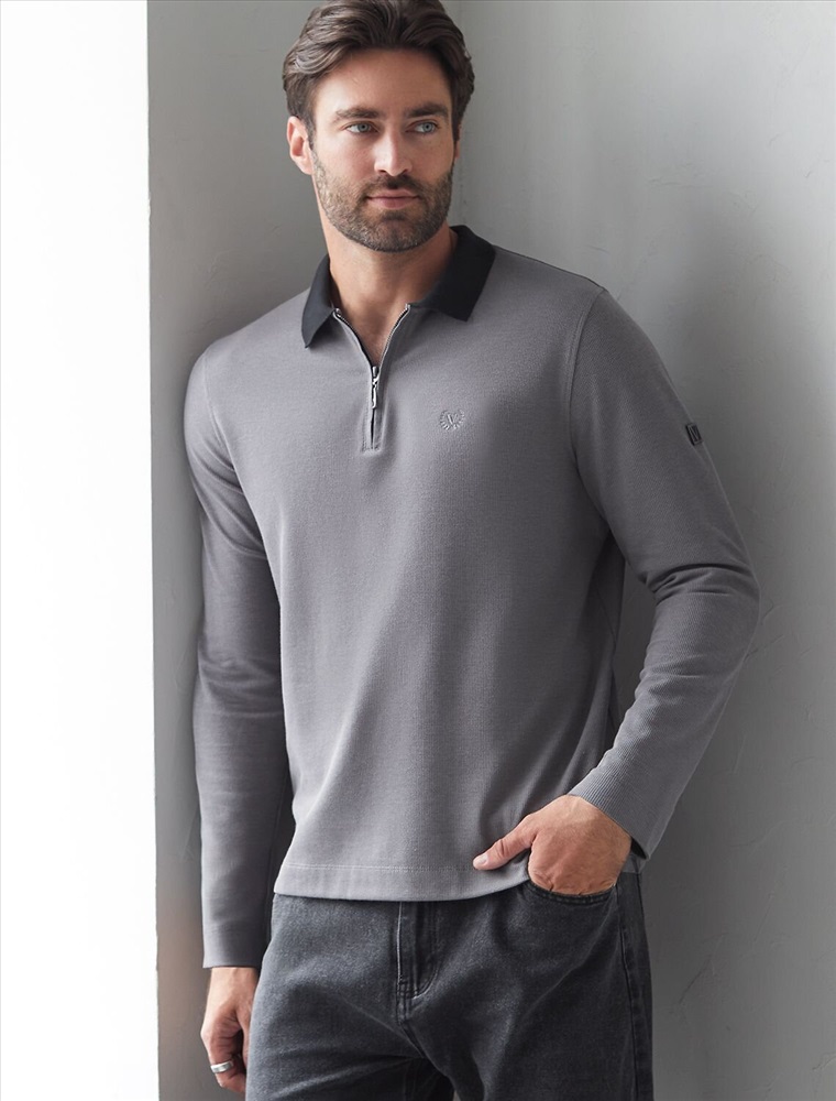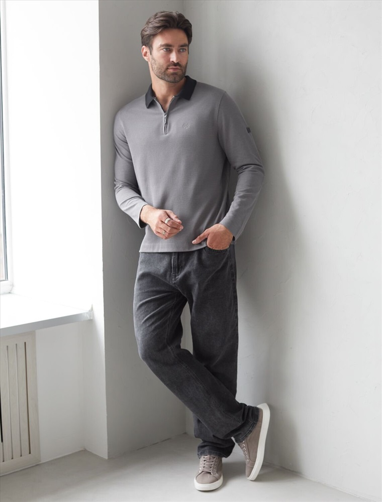 Стильный лонгслив темно-серого цвета с плетеным воротником поло с застежкой на молнию выполнен из премиального хлопка в сочетании с эластаном .Невероятно мягкая ткань из натуральных волокон - она едва ощутима на коже и словно обнимает тело. Материал при касании кажется бархатистым, при движении он словно повторяет все мельчайшие линии фигуры. По свойствам материал сочетает в себе практичность и нежность: отлично провускает воздух, сохраняя ощущение свежести в течение всего дня, при этом созраняет тепло в прохладную погоду.Идеально подходит для чувствительной кожи, не вызывает раздражения и дискомфорта. Удобный отложной воротник делает образ современным и стильным, а длинные рукава с манжетами защищают руки при ветреной погоде.