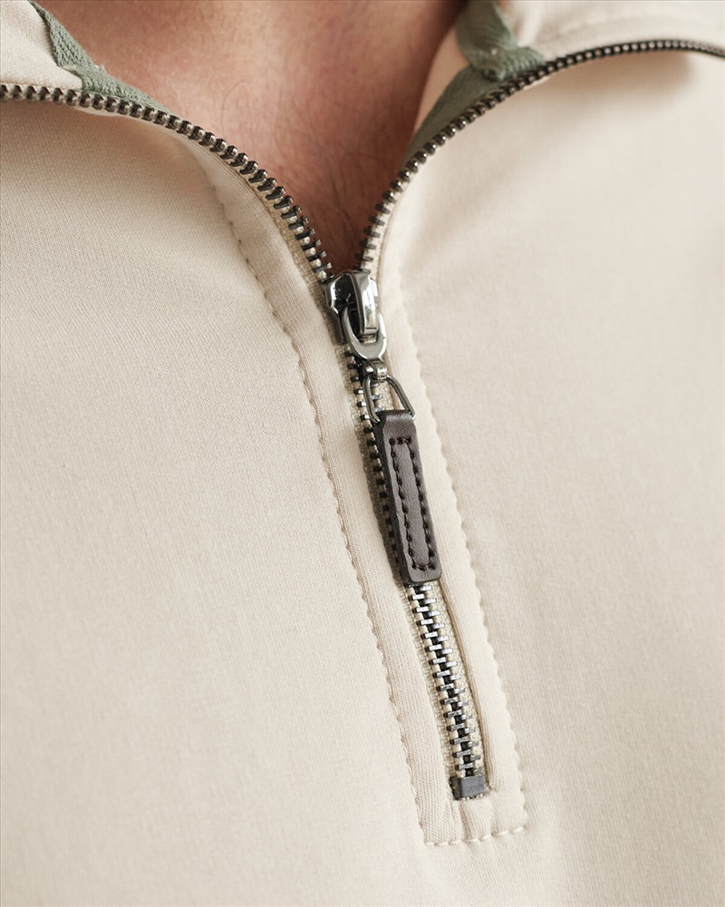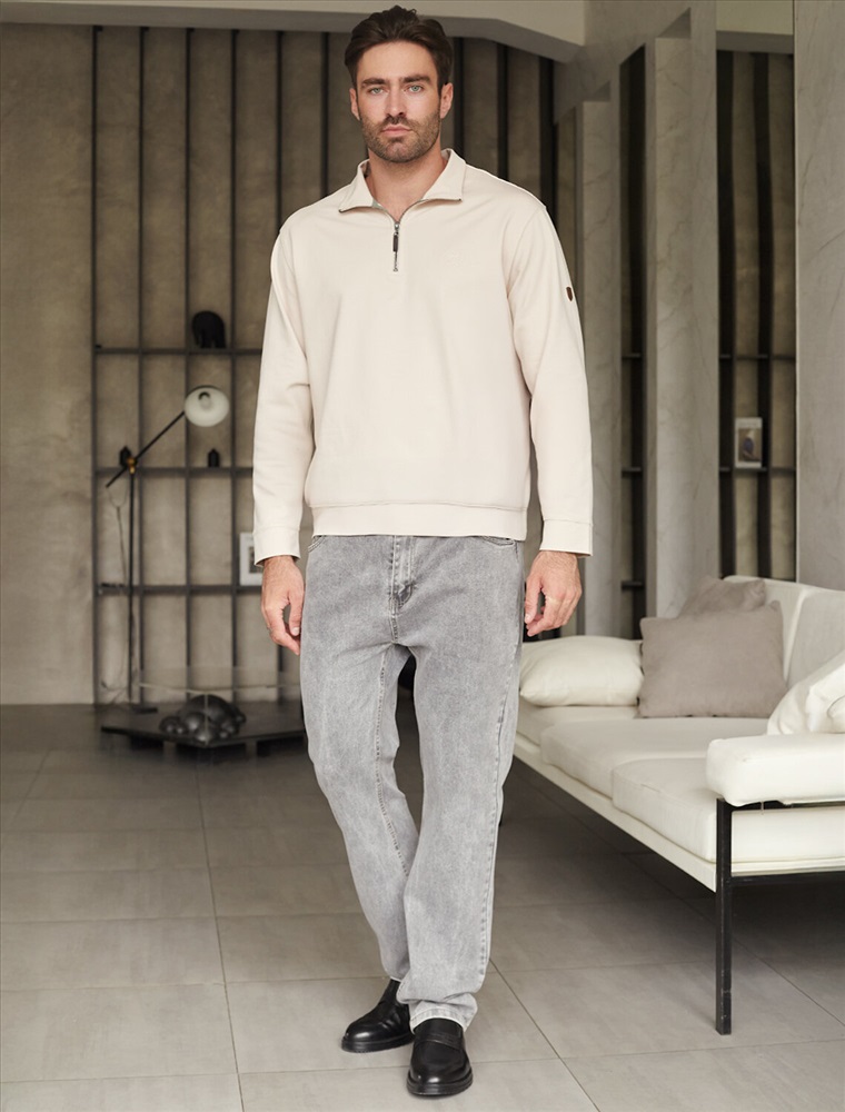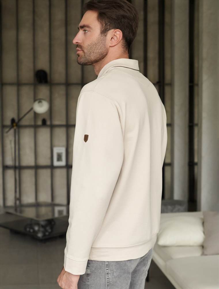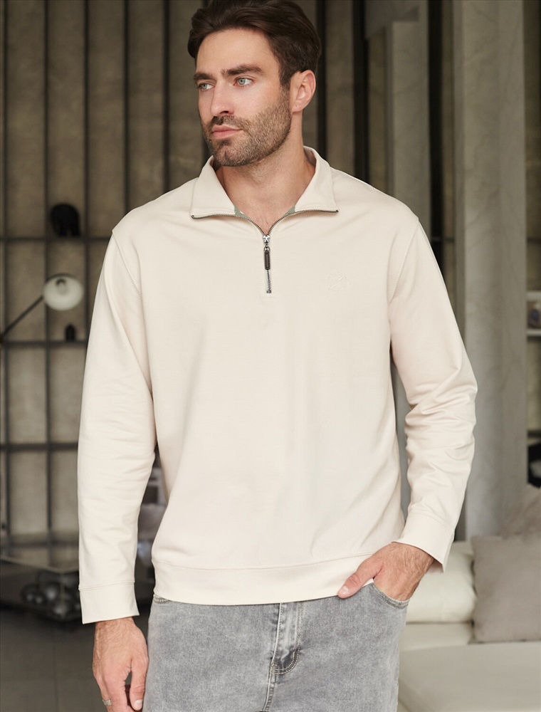 Уютный и стильный свитшот светло-бежевого цвета с воротом-стойкой на молнии - идеальный выбор для повседневного образа. Выполнен из премиального футера двухнитки с эластаном, Изнаночная сторона невероятно мягкая, что делает материал особенно приятным к телу. Благодаря эластичной структуре ткань хорошо тянется, сохраняет форму после длительной носки и обеспечивает свободу движений даже в самых активных буднях, а натуральный состав обеспечивает отличную воздухопррницаемость, позволяя коже дышать и не перегреваться.