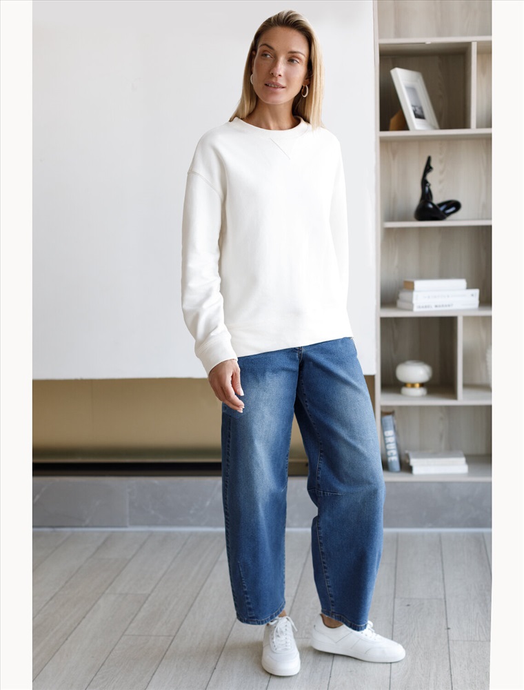 Широкие джинсы сочетаются с узкими ботильонами для трендового создания контраста объемов, а так же с обувью на плоском ходу. Эластичные свойства ткани обеспечивают удобные посадку и свободу движений — стрейч-материал делает повседневные джинсы особенно практичными для ежедневного гардероба. Прекрасно подойдет тем, кто ценит комфортные вещи без ущерба стилю. Эти багги легко комбинируются с укороченным верхом, облегающими водолазками или свободными рубашками в