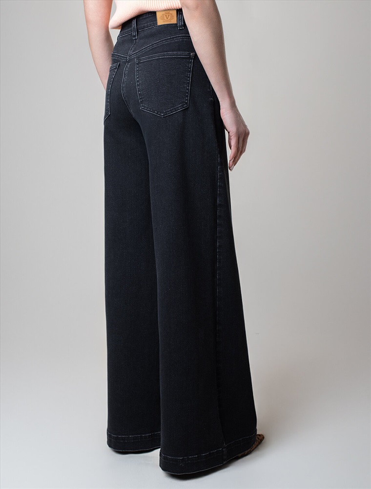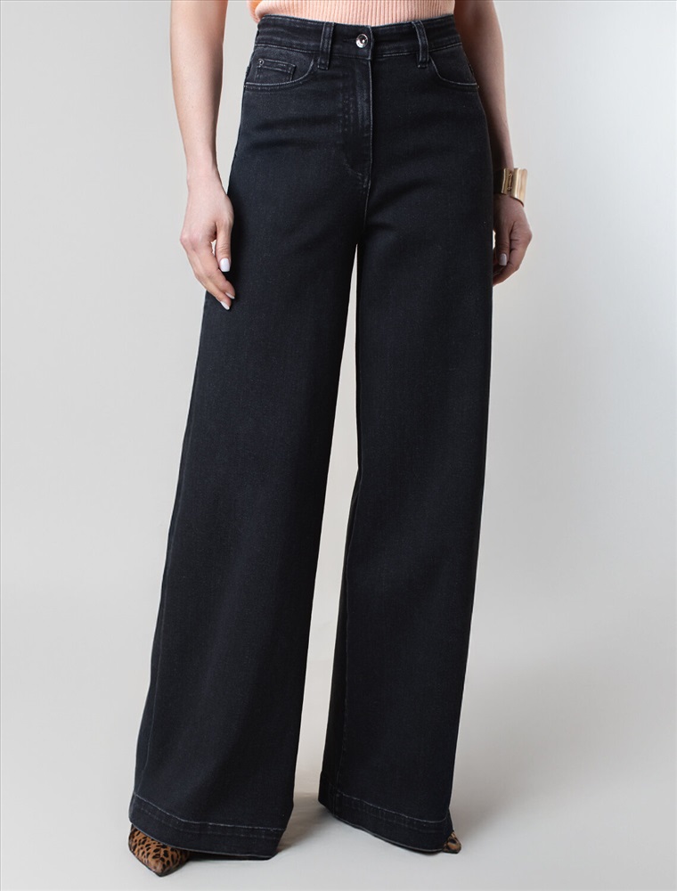 Стильные расклешенные джинсы трубы насыщенного черного цвета из эластичного денима созданы для современного образа и максимального комфорта. Плотный премиальный материал обеспечивает надежность и приятные ощущения при носке, а добавление эластичных волокон делает посадку особенно удобной. Высокая посадка и расширенный крой к низу визуально вытягивает рост и подчеркивает достоинства, делая силуэт женственным, а декоративная стирка добавляет акцент. Эти широкие джинсы - оличное решение для девушек размера полюс сайз. Детали продуманы до мелочей: мягкий пояс не сдавливает живот, задние карманы и шов расположены на правильном уровне, что бы визуально подтянуть фигуру, а натуральный материал сохраняет форму после длительной носки и частых стирок. Джинсы трубы подходят для высоких девушек и женщин, а так же не высоких, представлена различная ростовка.