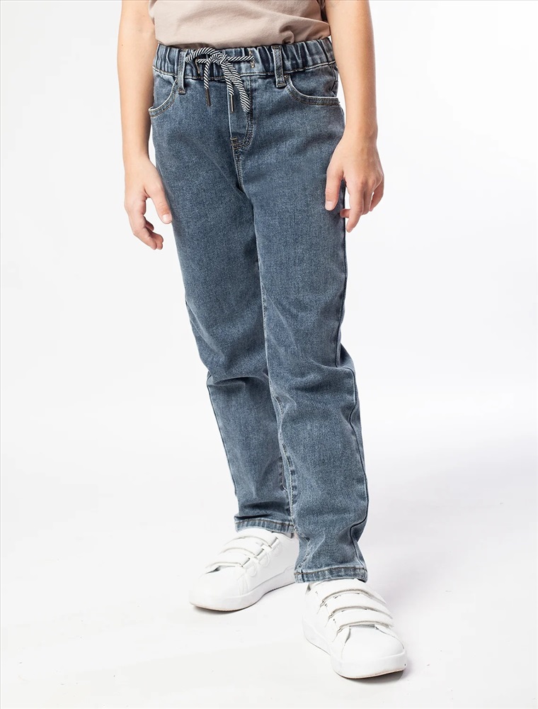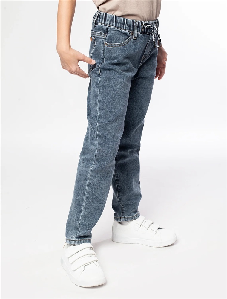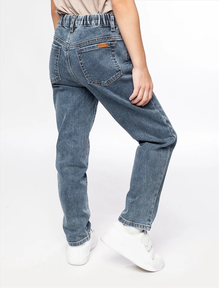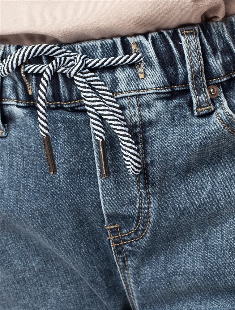 Серо-синие джинсы со стиркой выполнены из мягкого хлопка. Чтобы модель садилась по фигуре максимально комфортно, в состав денима добавили эластан. Удобства добавляют отсутствие ширинки и широкий эластичный пояс, не впивающийся в тело с дополнительным шнурком.