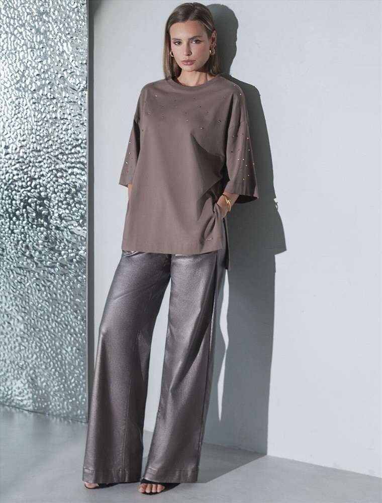 Оверсайз футболка кофейного цвета из премиального хлопка с добавлением эластана создана для комфорта и стиля каждый день. Натуральный материал приятный к телу, дышащая ткань хорошо держит форму и подходит для повседневной носки дома, в офисе или на прогулке. Классический свободный крой, удлиненный прямой силуэт и свободная посадка делают эту базовую футболку универсальным решением для любой фигуры и роста, включая плюс сайз размеры и беременных девушек, отлично скроет животик. Широкие рукава держвт форму и подойдут на полные руки. Нарядная футболка украшена авторским принтом в виде россыпи страз в тон основного полотна, которые создают красивый мерцающий эффект. Такой акцент делает модель уместной как для особых случаев, так и для ежедневных образов.
