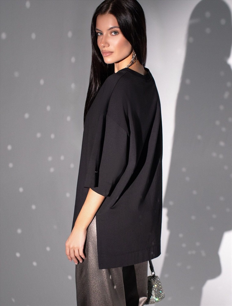 Такая эффектная длинная футболка станет универсальным дополнением гардероба, позволяя создавать разнообразные образы с акцентом на современный стиль и утонченность деталей. Благодаря стильному дизайну с боковыми разрезами эта футбол