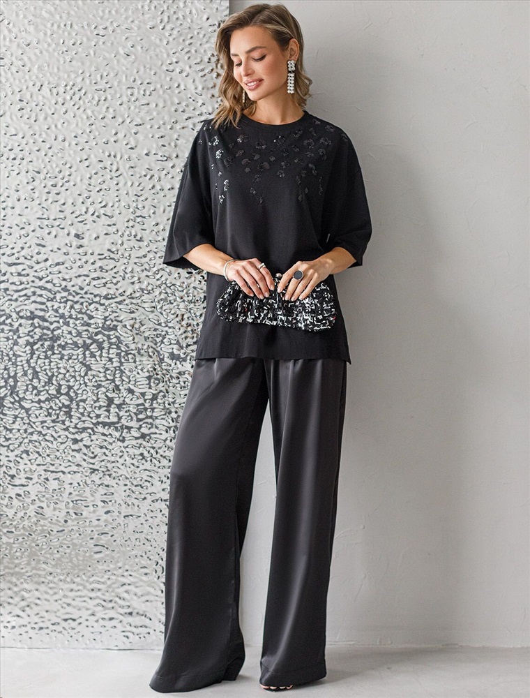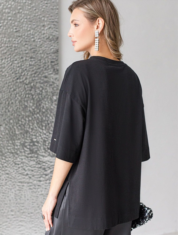Оверсайз футболка черного цвета из премиального хлопка с добавлением эластана создана для комфорта и стиля каждый день. Натуральный материал приятный к телу, дышащая ткань хорошо держит форму и подходит для повседневной носки дома, в офисе или на прогулке. Классический свободный крой, удлиненный прямой силуэт и свободная посадка делают эту базовую футболку универсальным решением для любой фигуры и роста, включая плюс сайз размеры и беременных девушек, отлично скроет животик. Широкие рукава держат форму и подойдут на полные руки. Нарядная футболка украшена авторским принтом пайетками. Такой акцент делает модель уместной как для особых случаев, так и для ежедневных образов.