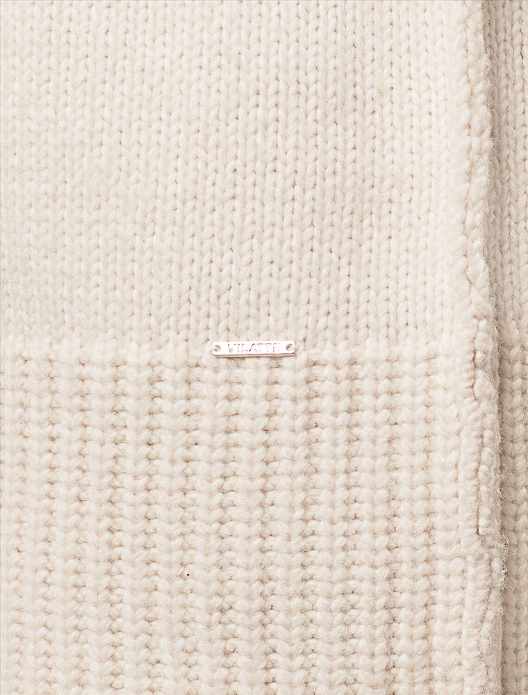 Свитер в овсяном оттенке выполнен из уютной пряжи крупной вязки с ангорой и легким пушистым мохером, поэтому изделие получилось особенно приятным на ощупь. Пряжу укрепили нитями нейлона, благодаря чему изделие не вытянется со временем и сохранит свою форму. Лаконичную модель дополнили металлическим логотипом бренда.