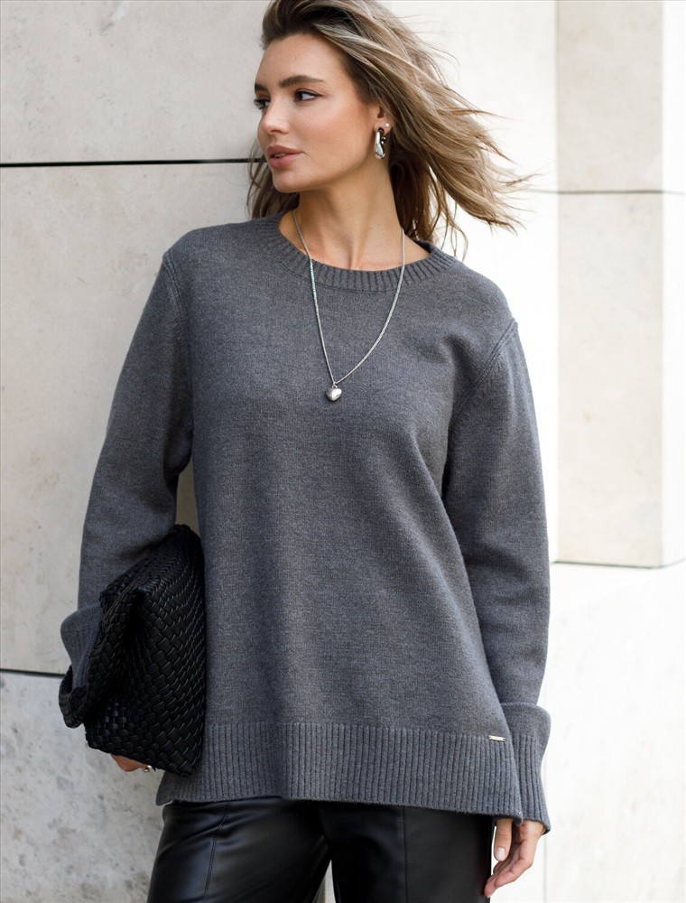 Джемпер с круглым воротом выполнен из мягкой меланжевой пряжи с кашемиром. Лаконичная модель свободного силуэта дополнена боковыми разрезами. Мягкая пряжа очень приятная к телу, поддержит комфорт на протяжении всего дня. Сочетается в костюме с брюками D38.013, D38.012 и юбкой D36.016