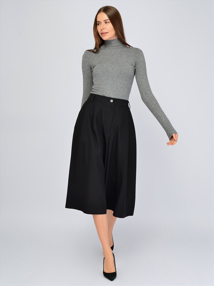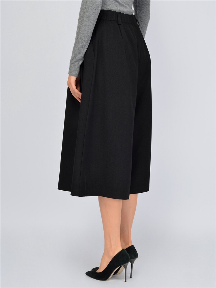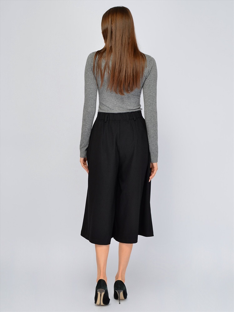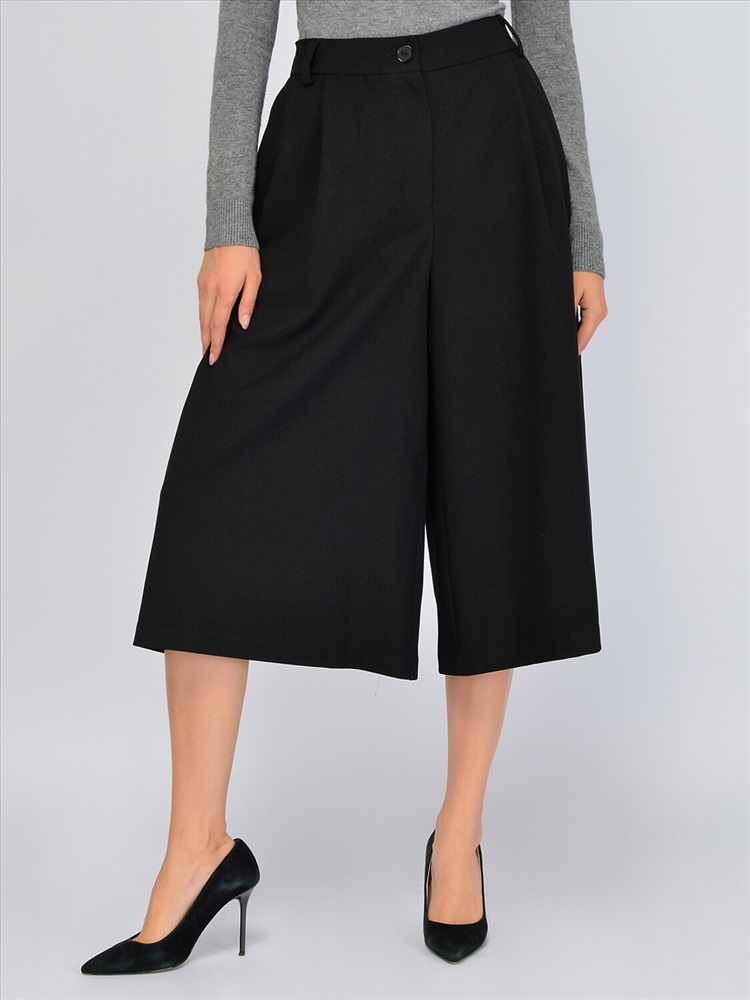 Свободные кюлоты это актуальный элемент гардероба, который придется по вкусу тем, кто предпочитает классический и при этом современный стиль в одежде. Высокая посадка создает гармоничные пропорции фигуры, не укорачивая рост. По задней части пояса проходит резинка, обеспечивая правильную посадку на талии. Застегивается модель на пуговицу и молнию. Укороченные брюки оснащены карманами по бокам для удобства современных девушек. Спереди на изделии находятся декоративные складки, благодаря которым кюлоты изящно струятся при ходьбе и сохраняют широкую форму. Базовые брюки ниже колена не облегают бедра и помогут скрыть возможные недостатки фигуры. Трендовая модель впишется не только в классические строгие образы, но и в повседневные городские, обеспечивая максимальный комфорт и не стесняя движений. Модные свободные кюлоты идеально сочетаются с комплектным жилетом из нашей коллекции, а также с различными блузками, рубашками, водолазками. Обувь желательно выбирать на высоком ходу, чтобы подчеркнуть длину Ваших ног