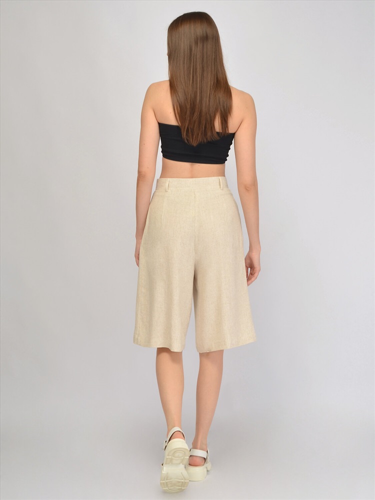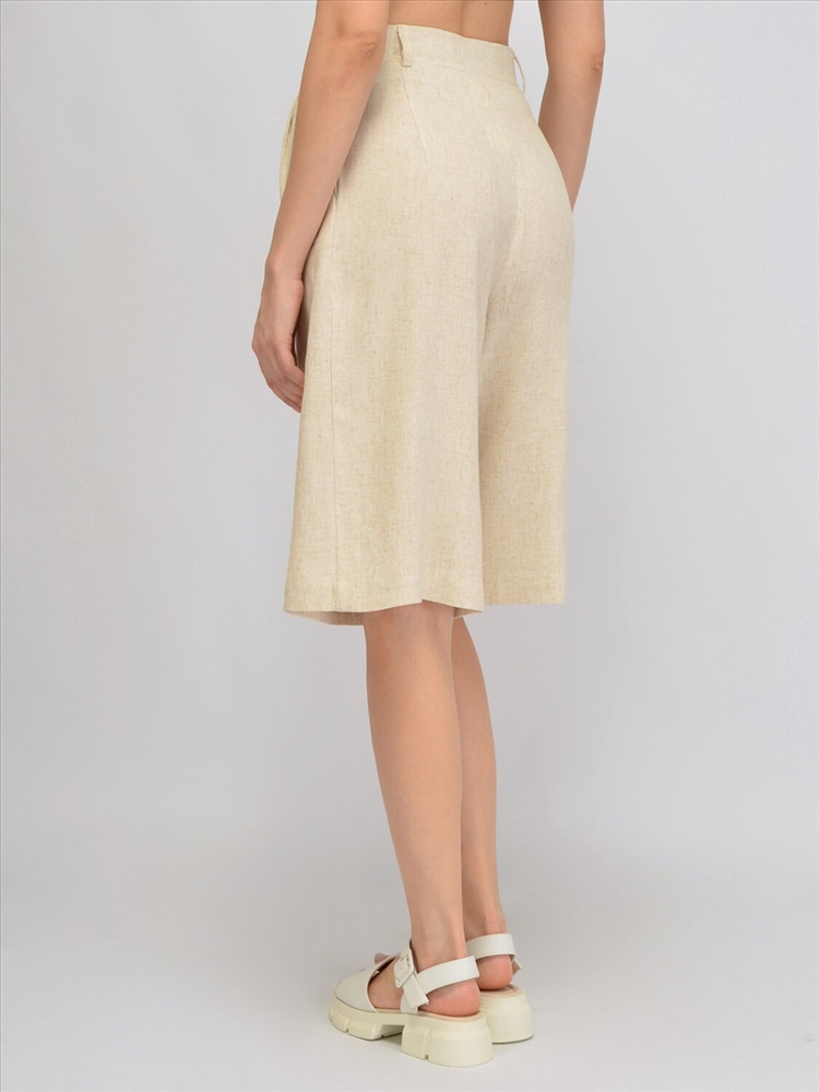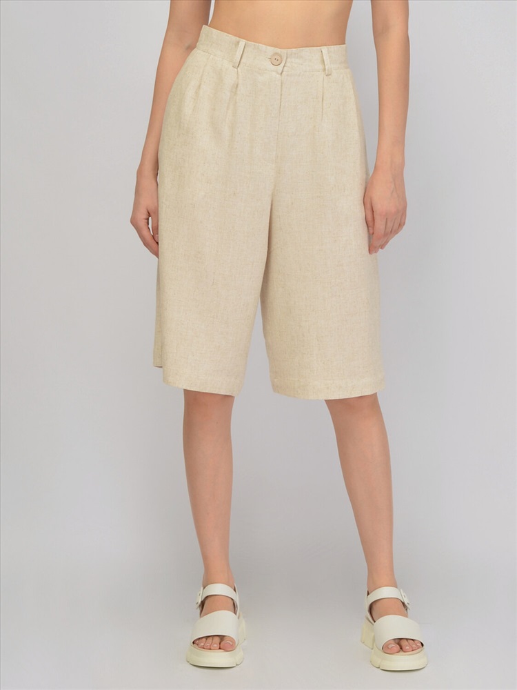 Свободные шорты ниже колена это трендовый элемент гардероба, который придется по вкусу тем, кто предпочитает совмещать стиль и комфорт в одежде. Широкие шорты в классическом стиле выполнены из 100% вискозы, которая позволит коже дышать даже в самый жаркий день. Высокая посадка создает гармоничные пропорции фигуры, добавляет несколько сантиметров росту. Застегиваются кюлоты на молнию и пуговицу, а в поясе находятся шлевки, в которые следует вставить ремешок. Укороченные брюки оснащены карманами по бокам для удобства современных девушек. Спереди на изделии находятся декоративные складки, благодаря которым кюлоты изящно струятся при ходьбе и сохраняют широкую форму. Базовые брюки ниже колена не облегают бедра и помогут скрыть возможные недостатки фигуры. Длинные летние шорты впишутся не только в классические строгие образы, но и в повседневные городские, обеспечивая максимальный комфорт и не стесняя движений. Модные свободные кюлоты идеально сочетаются с комплектной рубашкой из нашей коллекции, а также с различными футболками и топами.
